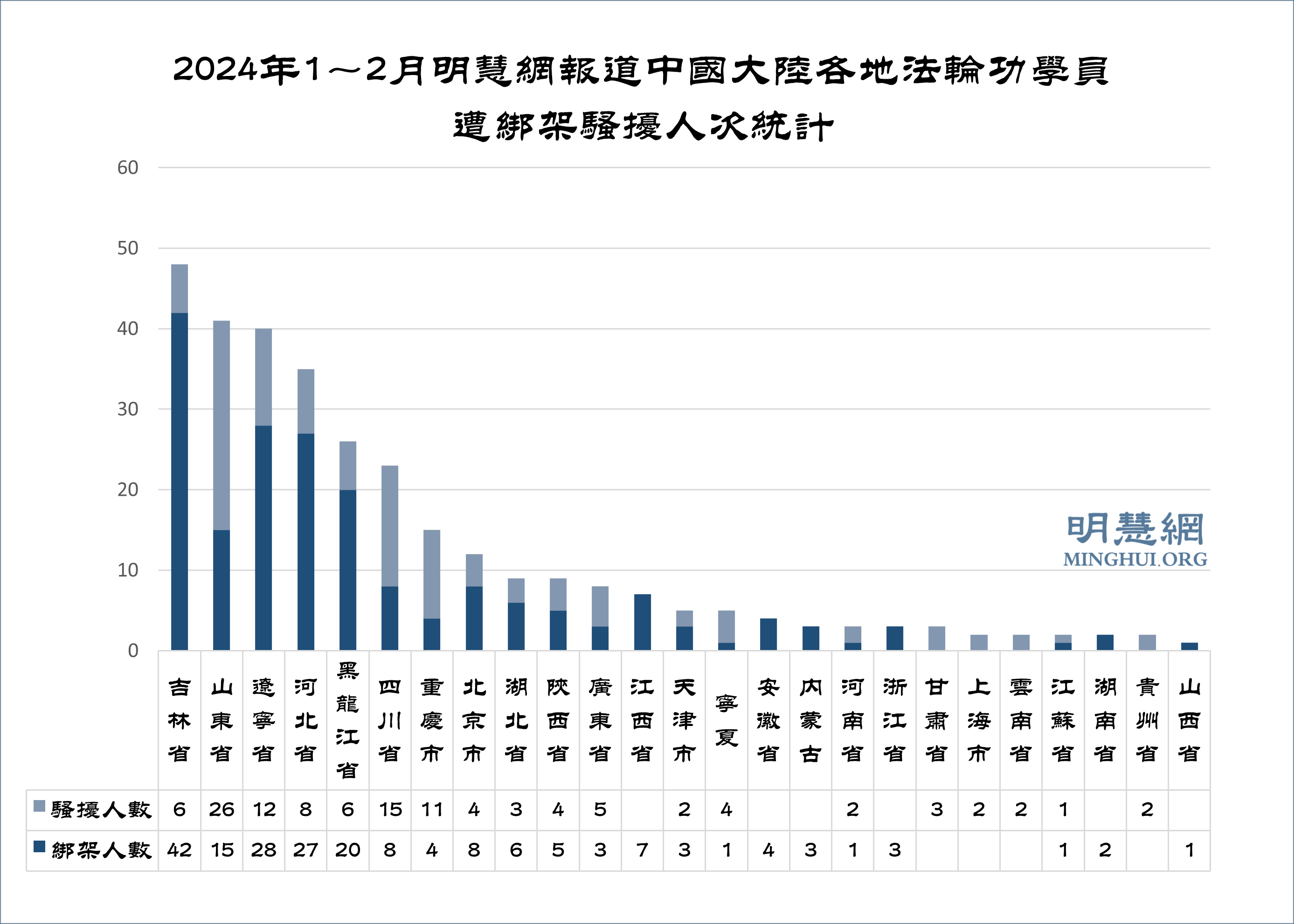 ![]() 2024年1~2月明慧网报道中国大陆各地法轮功学员遭绑架骚扰人次统计 |