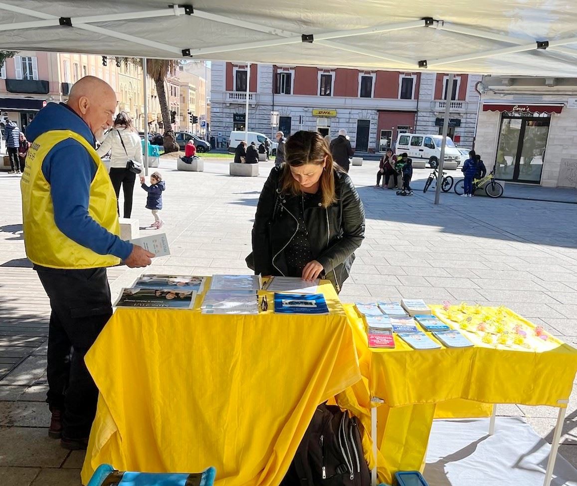 二月二十四日,学员在卡亚利加里波第广场(Piazza Garibaldi)举行弘法活动,并在同一广场举行反迫害征签。尽管当天天气阴沉,但仍有许多人前来,对真相展板和横幅感到好奇,想知道它的内容。了解真相后,很多人都想签名制止迫害。
