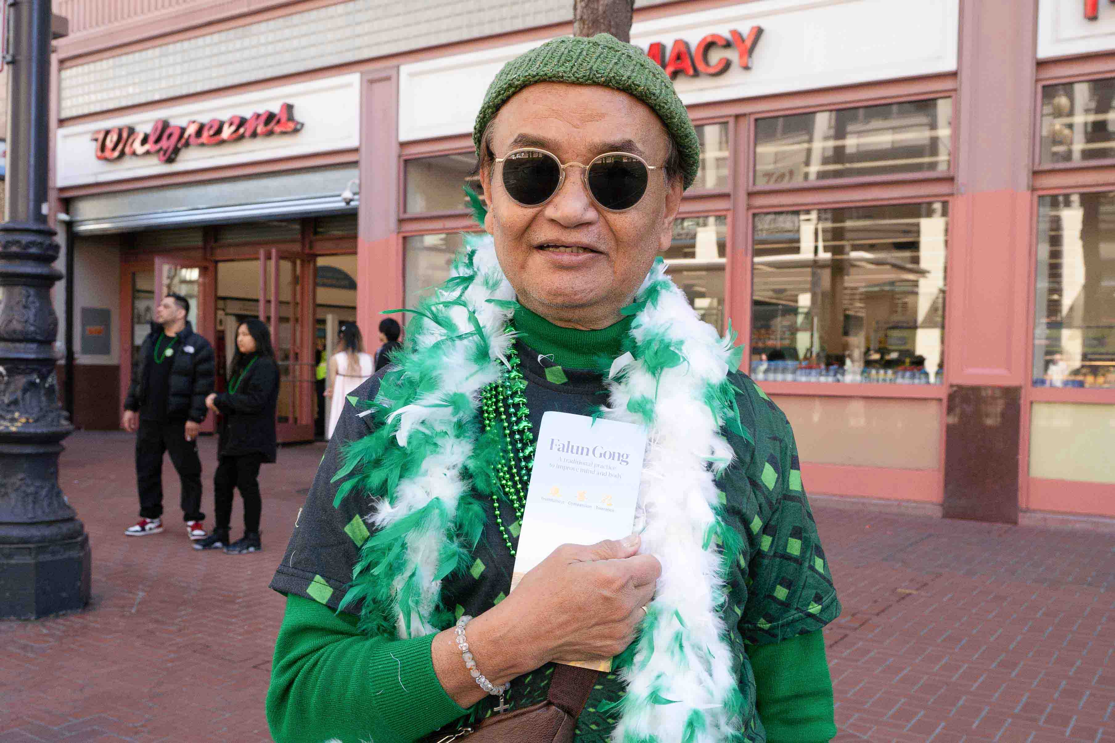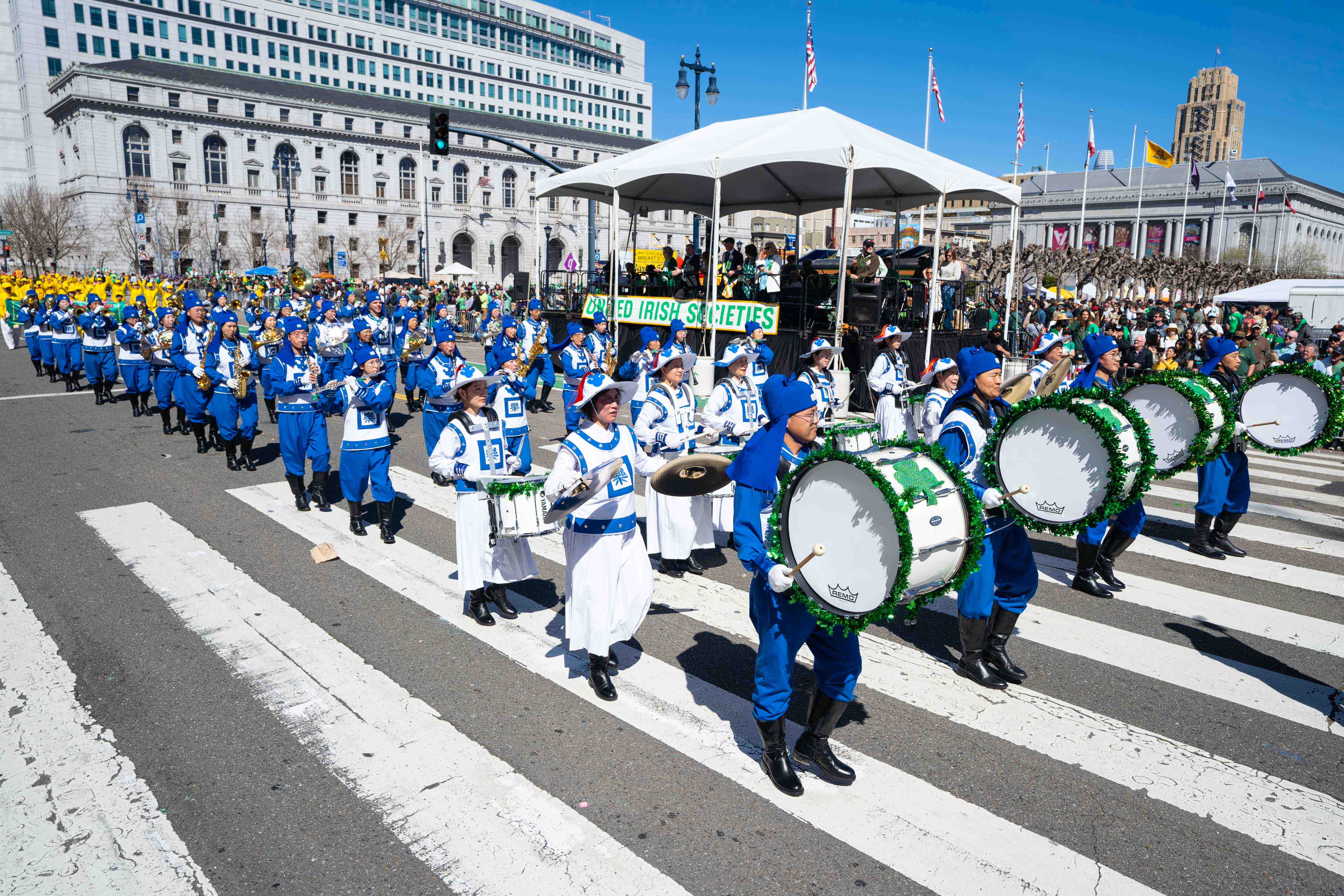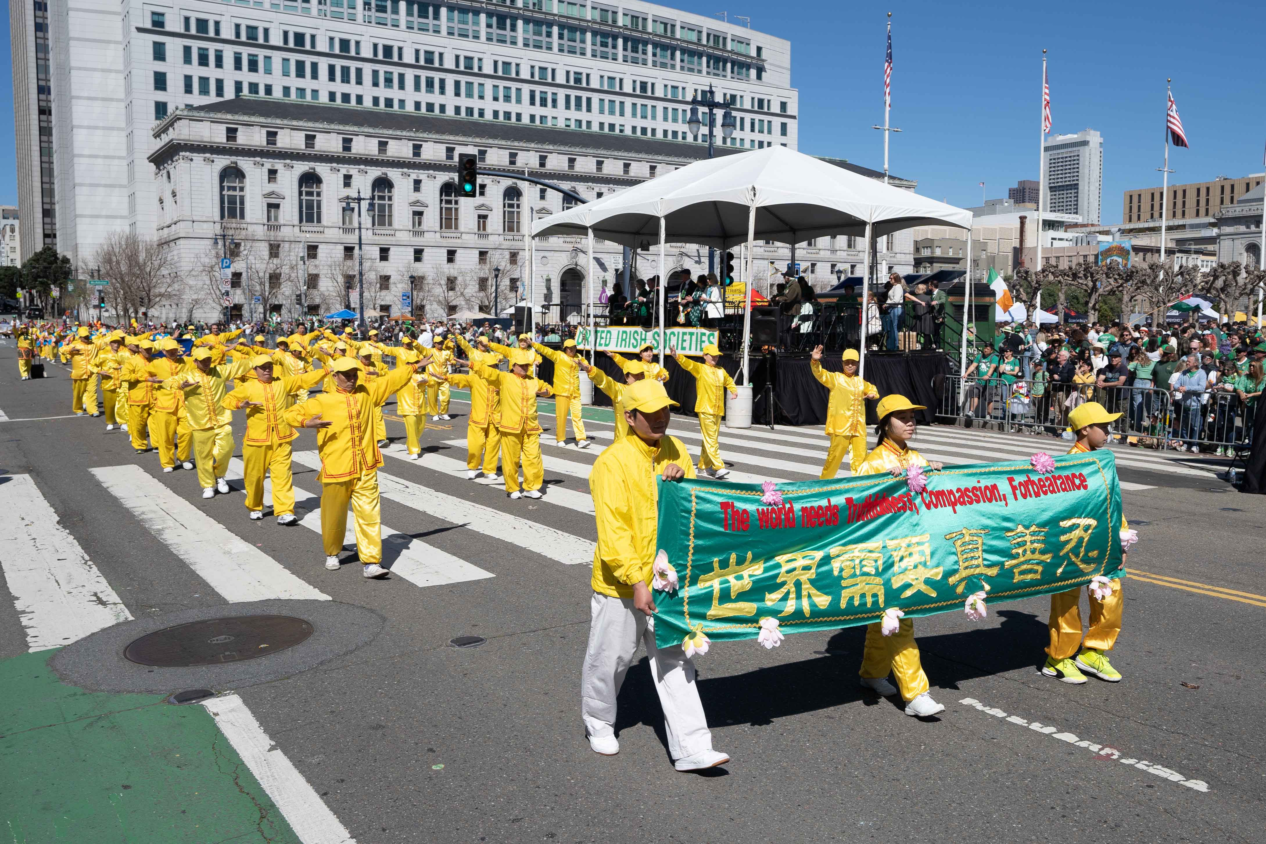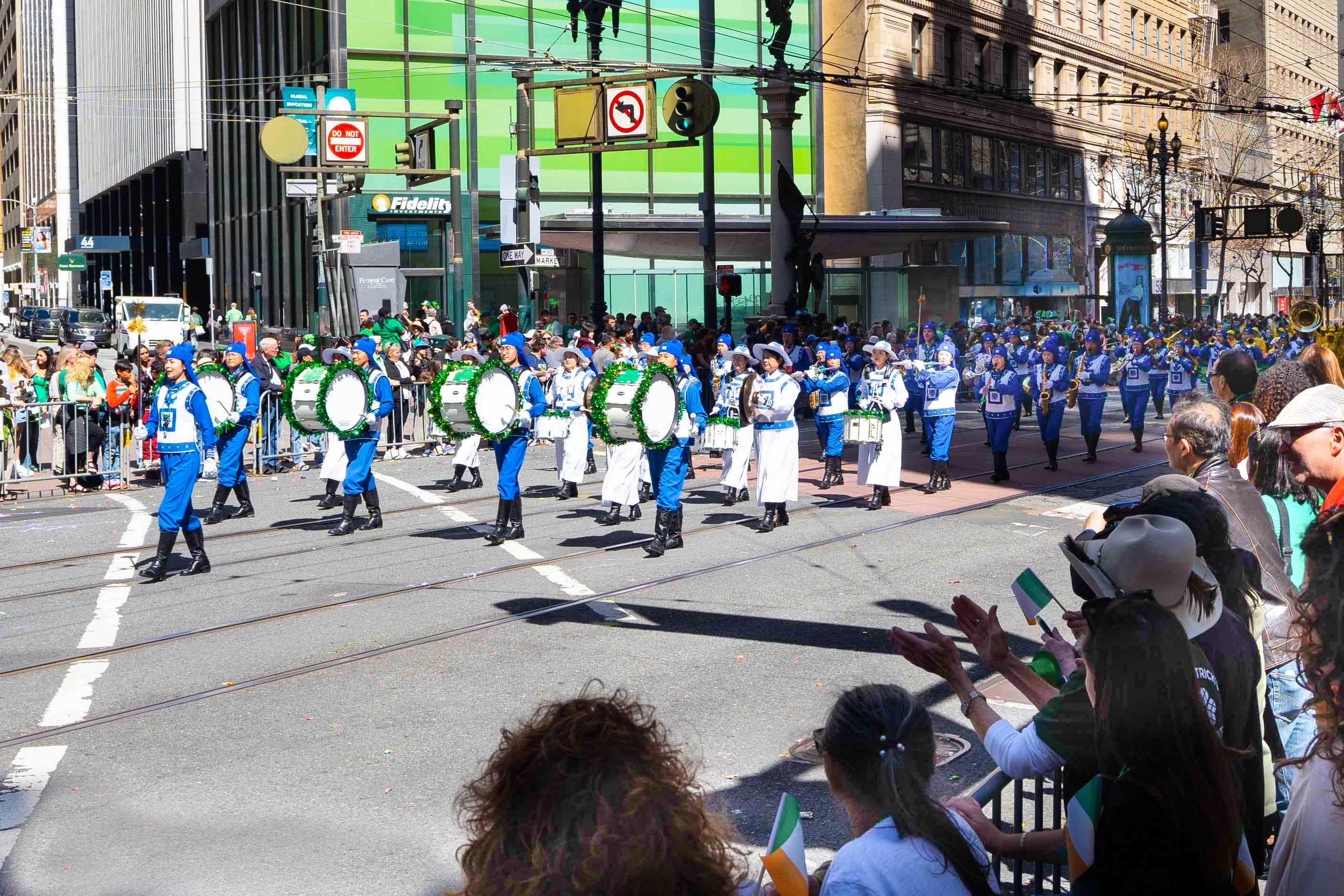 参加旧金山圣帕特里克日游行的法轮功学员队伍是历年来阵容最大的,有法轮功炼功队、腰鼓队和美西天国乐团。许多观众随着天国乐团演奏的雄壮乐曲舞蹈着;有的高兴地跟法轮功学员的队伍一起拍照留念;还有的观众向法轮功学员竖起大拇指。