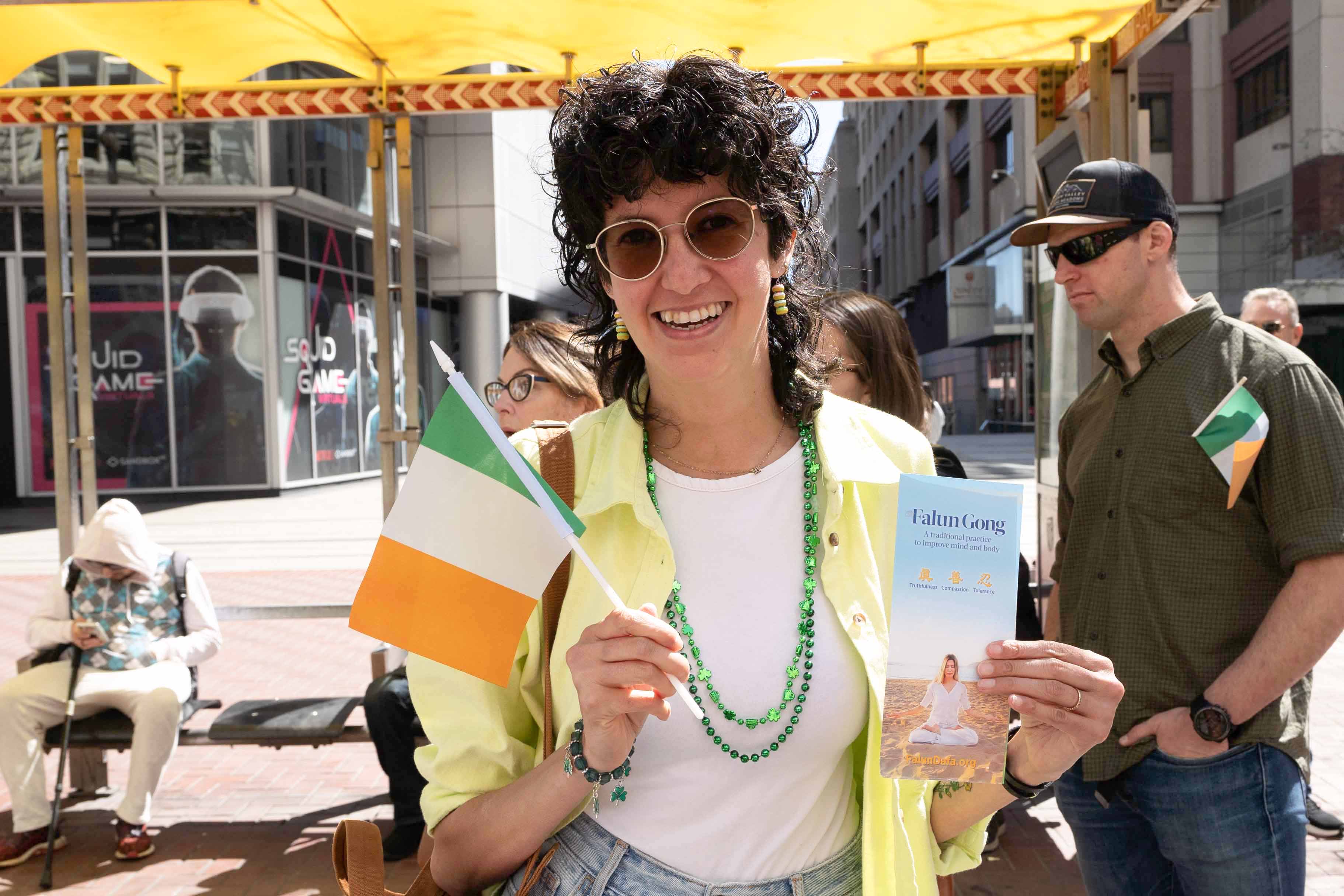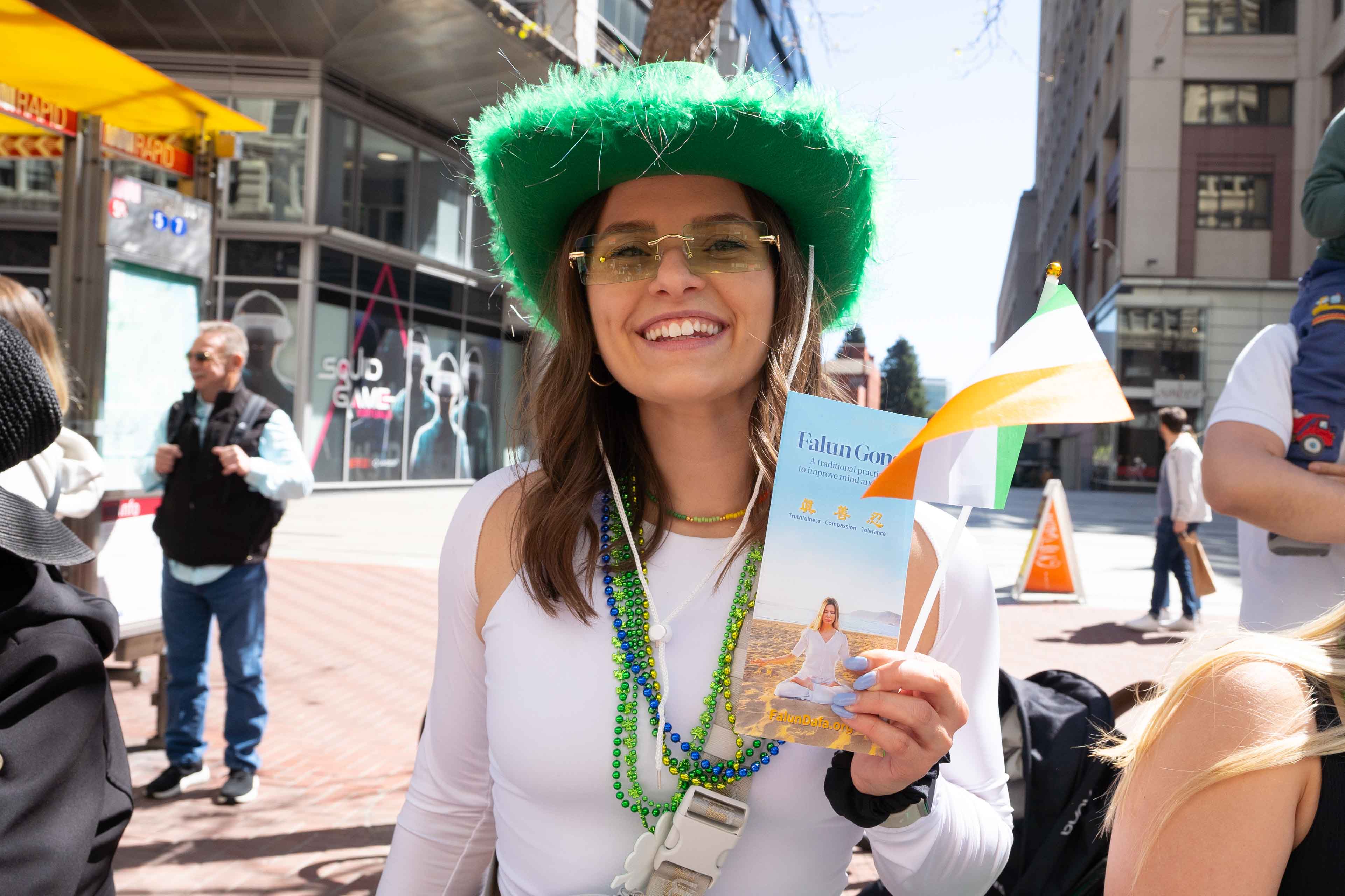 旧金山爱尔兰裔观众Kim Boyd在路边为参加游行的法轮功学员鼓掌喝彩。她说:“他们太美了,令人感到震撼,非常高兴我们今天能看到这支队伍。”“我喜欢真、善、忍原则,这是个伟大的原则。”