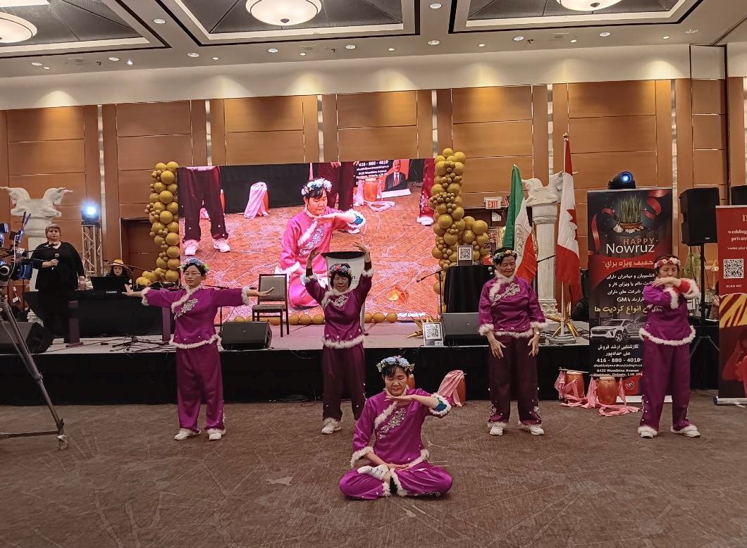 ![]() 图1:学员在舞台上展示法轮功的五套功法,同时配有波斯语的解说。 |