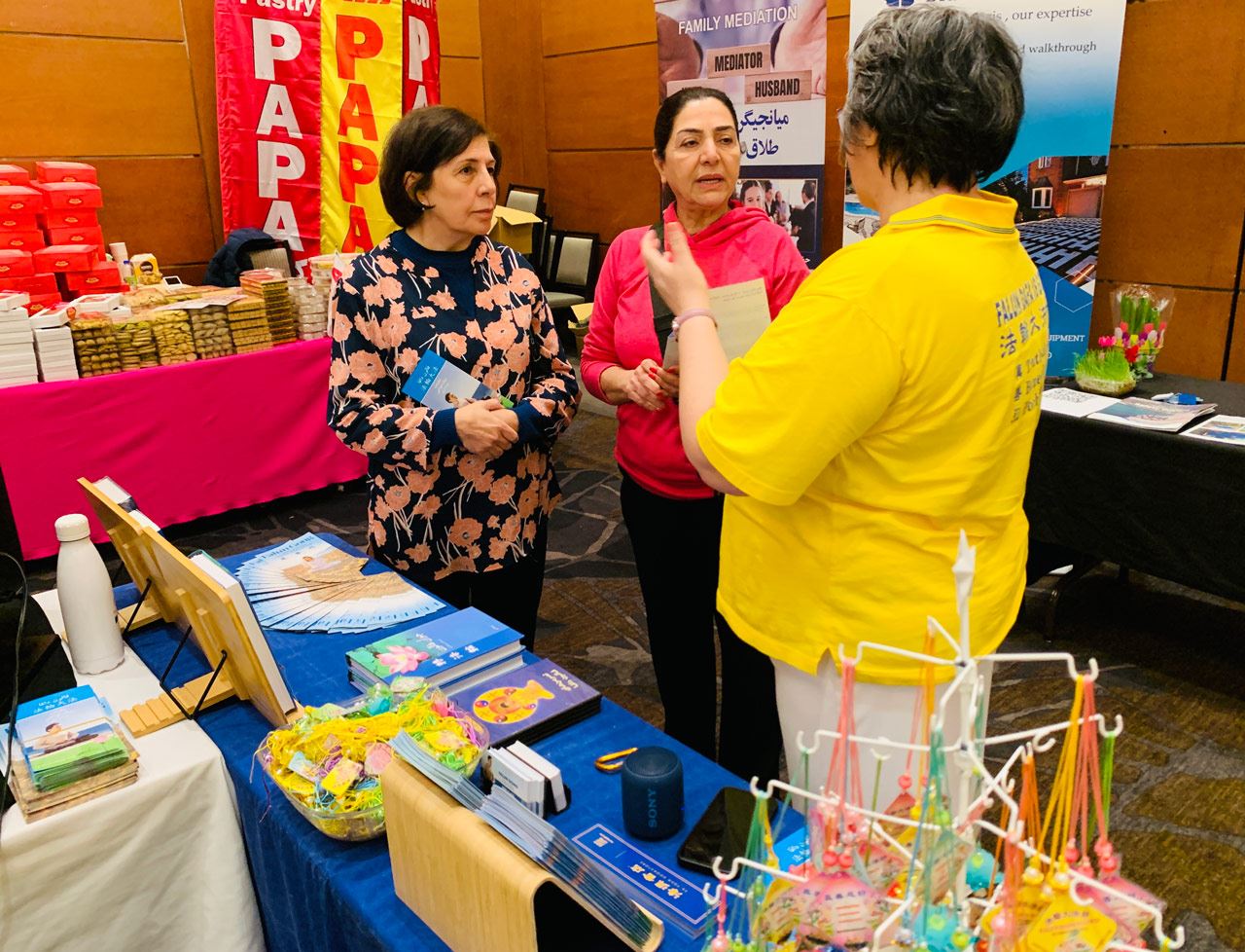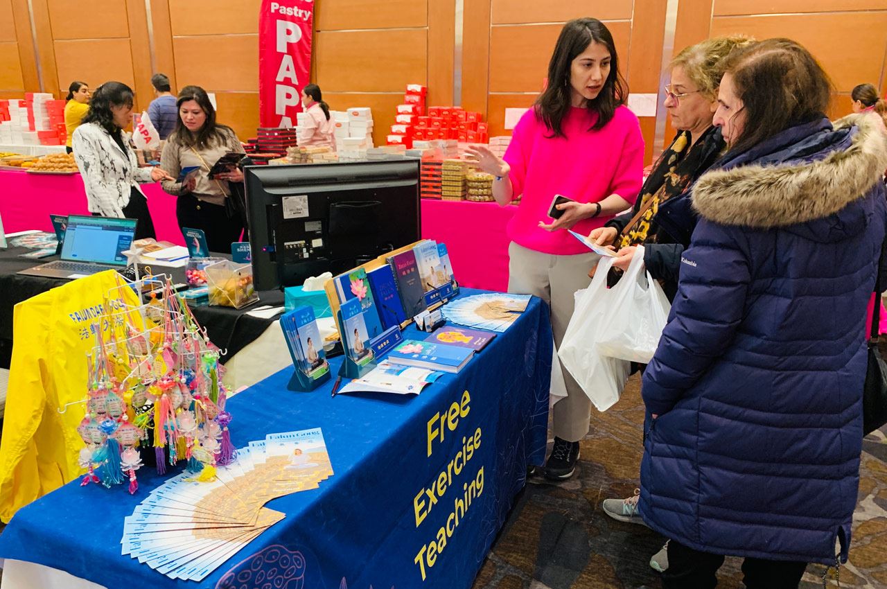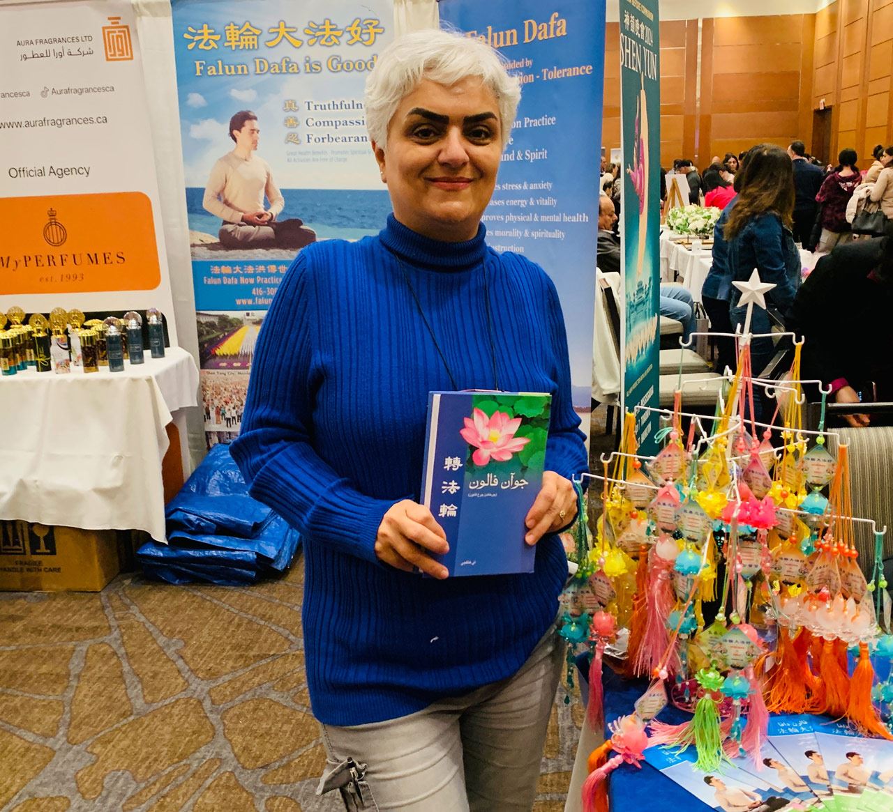 努辛(Nooshin)在姐姐的展位上帮忙。活动的第一天,她就来法轮大法展位串门,跟学员简单学炼了功法,还购买了波斯语的《转法轮》。后来,她又回到了大法展位,告诉学员:“我已经开始读《转法轮》了。我很喜欢这本书,因为这是一本能让所有人都受益的书。开始读书后,我的身体感到轻松。可昨天晚上,我突然开始咳嗽、全身疼痛,我之前从未有过这些症状。我觉得一些坏的物质离开了我的身体,之后我又感到轻松了。”