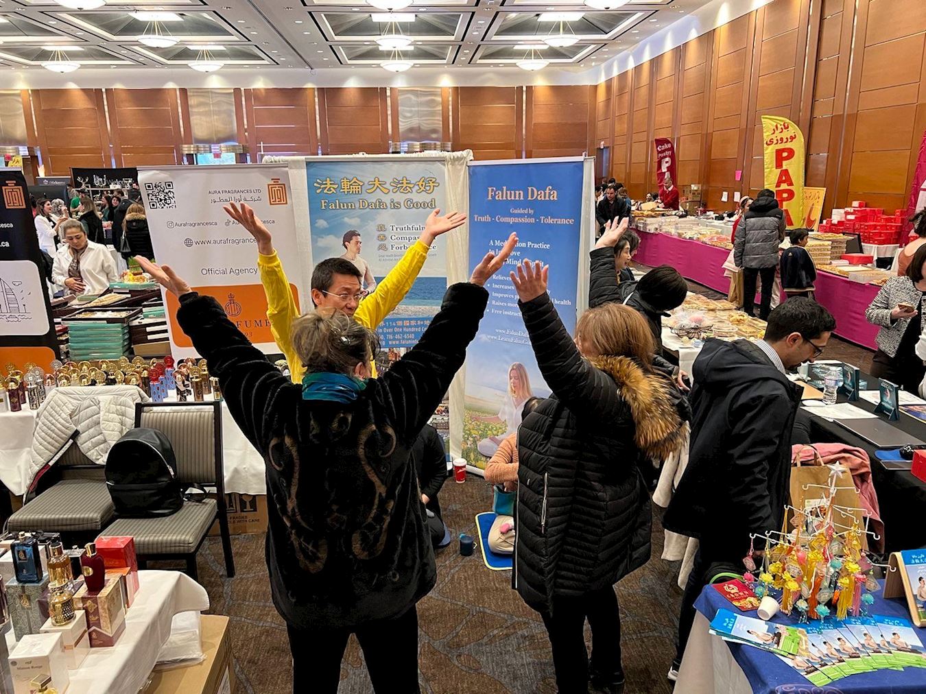法轮功学员的展位吸引了众多伊朗及其他族裔的来客,展位上的义工都忙得不亦乐乎。客人们反馈,在展位上感受到了平静、祥和的氛围。有人在学炼功法时,抬起了长期不适的胳膊,感动落泪;有客人购买了《转法轮》,想要认真阅读后找到人生答案;有华人聆听讲解后,现场做了三:退.。法轮功学员还在舞台上展示了五套功法,同时配有波斯语的解说。