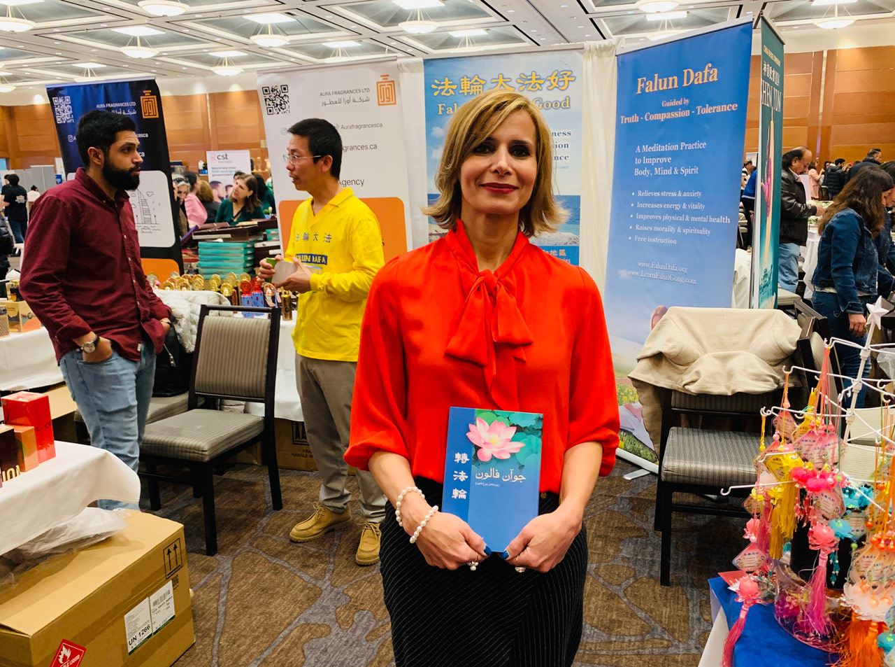 娜塔莉(Natalie)来自伊朗,是一家游泳池公司的老板,业务包括泳池的设计、升级等。她的公司展位就在法轮大法展位的对面。从活动第一天起,她就默默关注着大法展位。学员见她一直看向展位,便向她介绍了功法,她立刻决定购买《转法轮》。