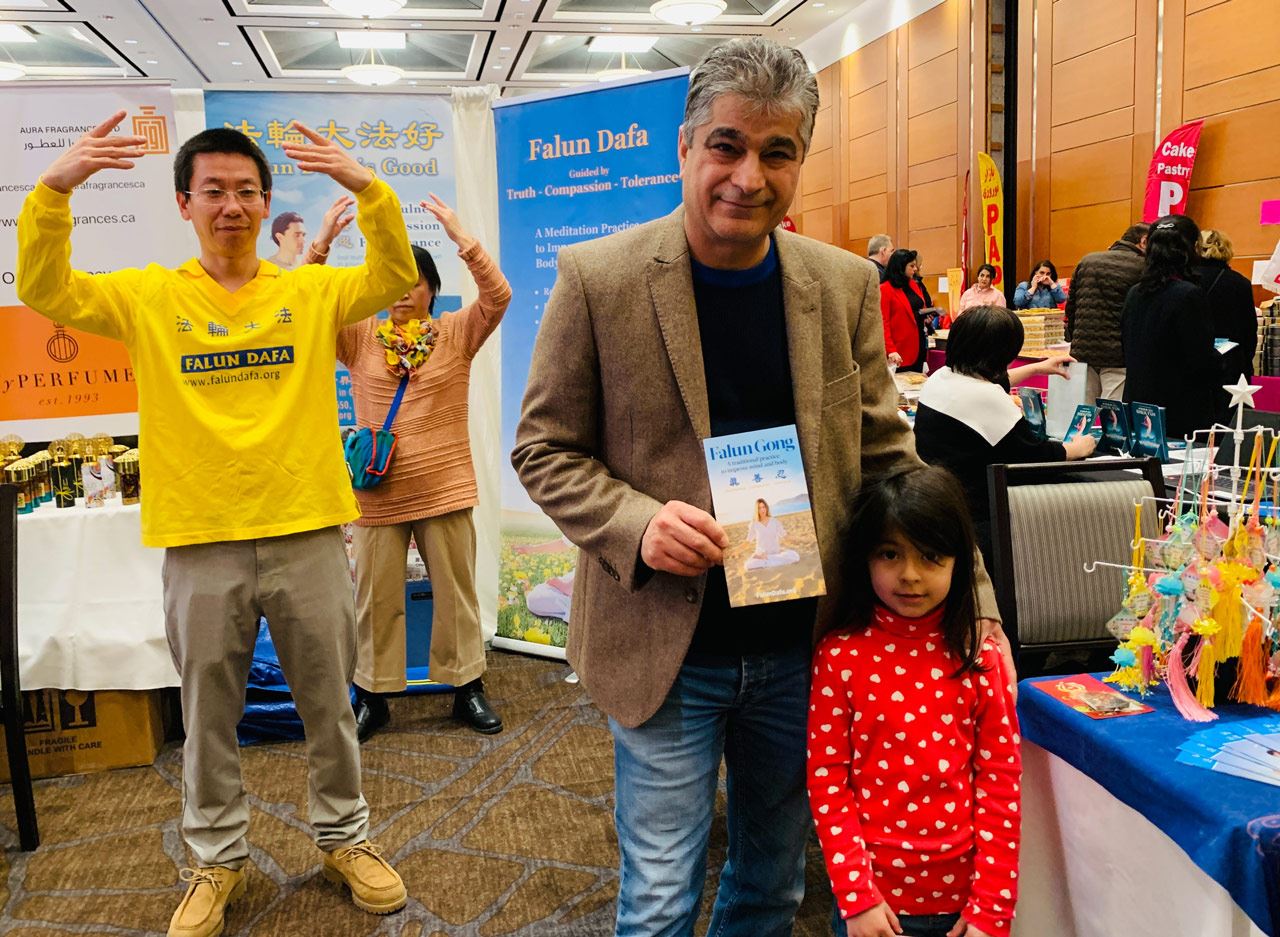 马赫迪(Mahdi)是名工程师。他牵着小孙女经过时,被展位上的功法介绍吸引了。他对学员说:“我想要摆脱压⼒,我想学法轮功。”于是,他和小孙女一起学炼了功法。
