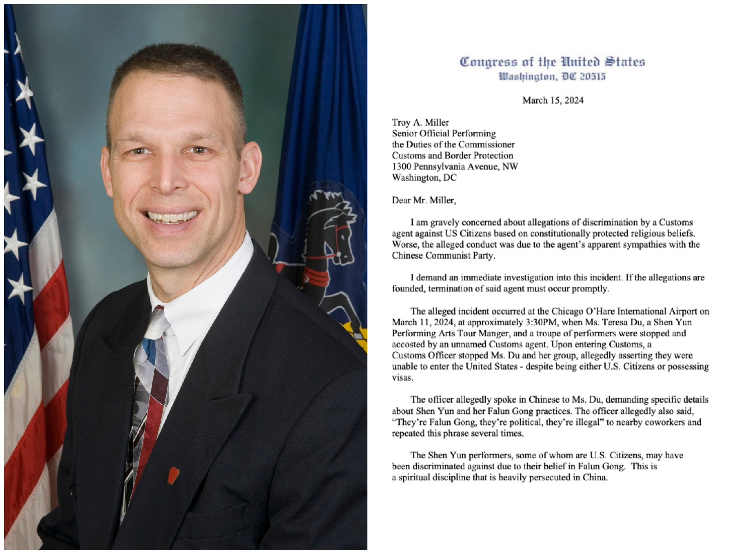 ![]() 图2:美国国会众议员斯科特·佩里(Scott Perry)致信给美国海关和边境保护局(CBP)代理局长特洛伊·米勒(Troy Miller),要求立即调查海关职员阻神韵演员入境事件。 |