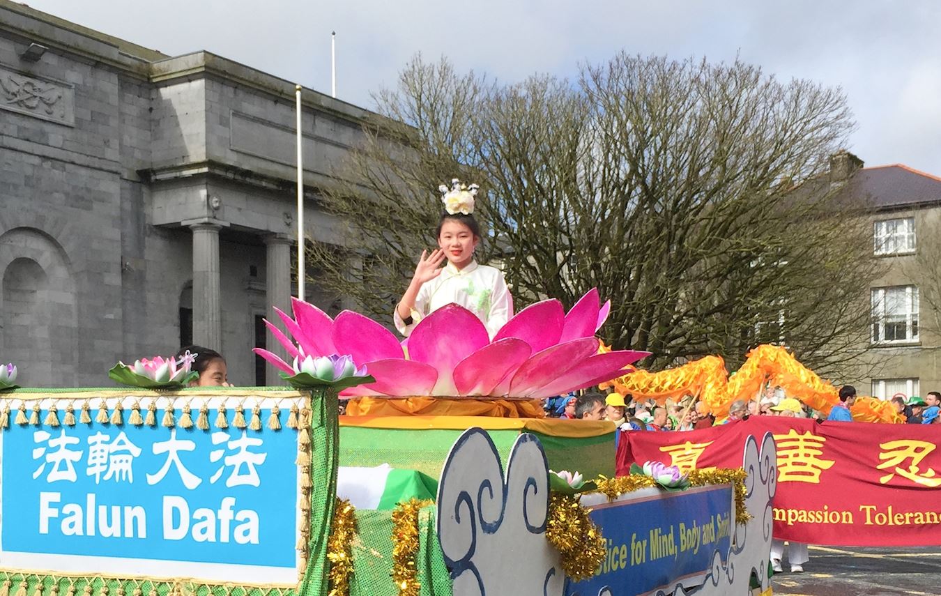 队伍经过主席台时,主持人介绍说:“法轮功以真、善、忍为准则,包含五套功法,在全世界一百多个国家和地区都有人修炼。在过去的二十三年里,法轮功在爱尔兰很受欢迎。”