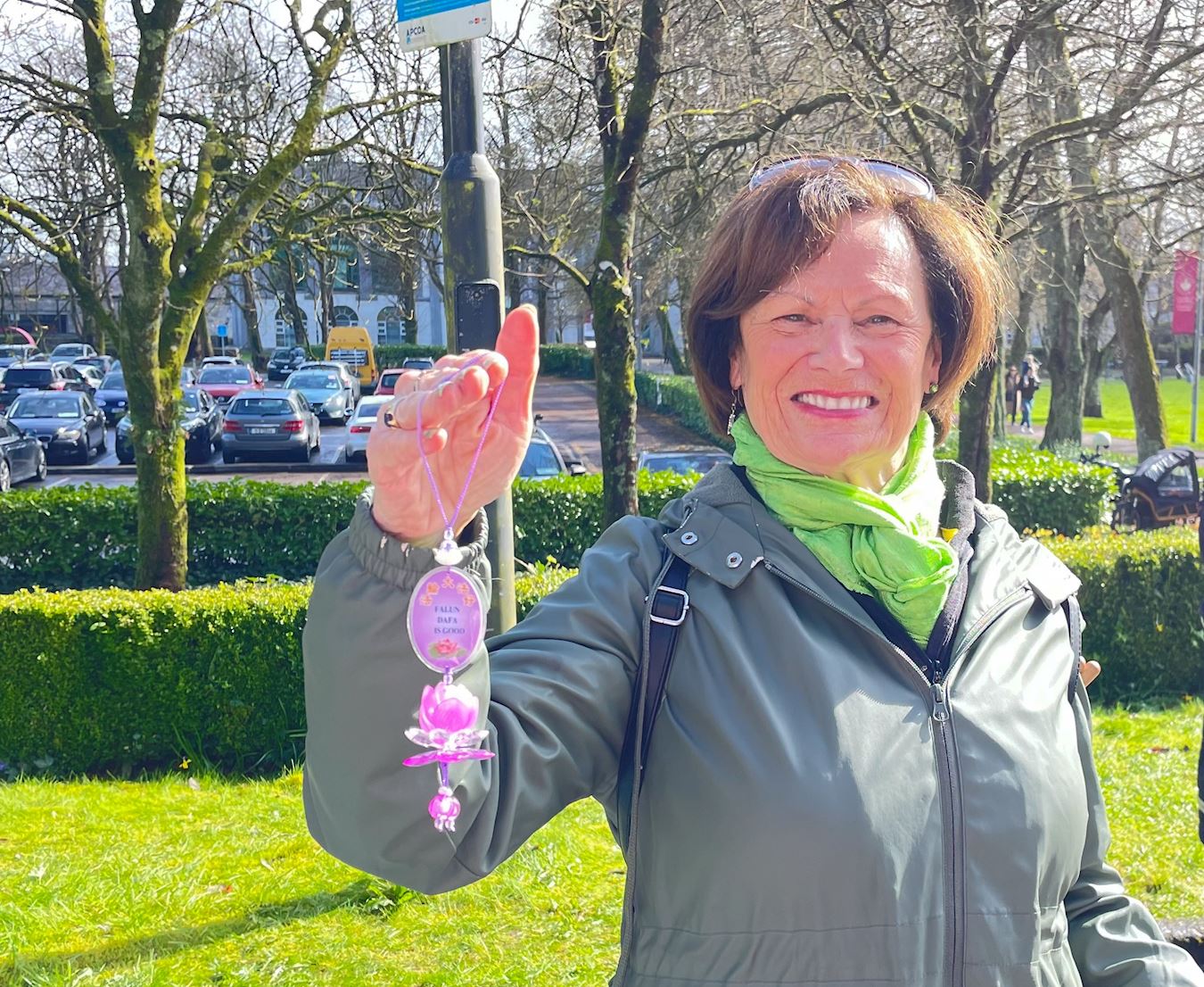 ![]() 图4:爱尔兰观众派翠莎手举真善忍小莲花,称赞法轮功方阵:“太棒了!” |