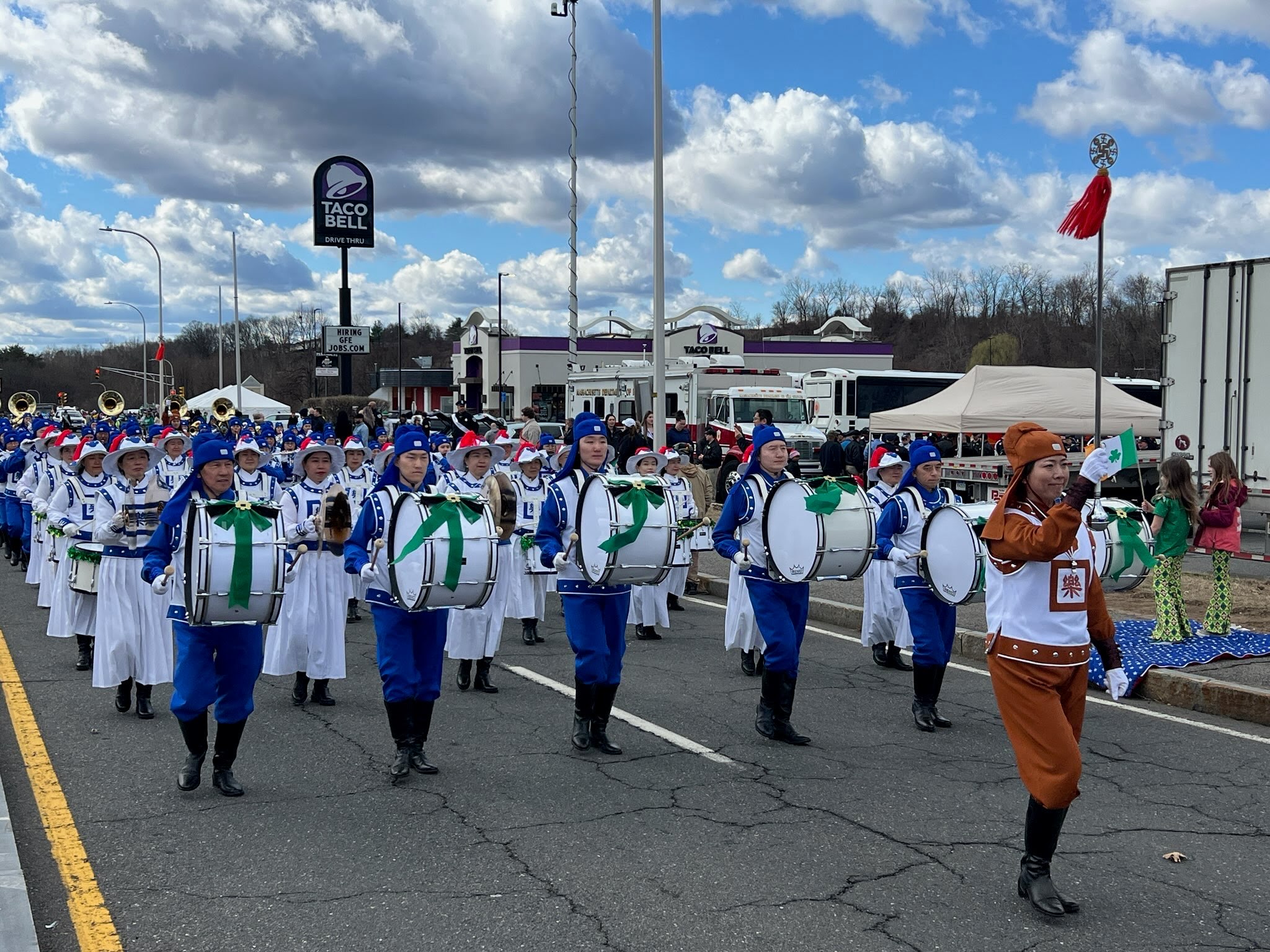 当天国乐团到达主席台时,演奏了《神圣的歌》。主持人介绍说:“这是天国乐团第四次参加这个游行,二零二三年他们获得‘最佳游行队伍’奖。天国乐团于二零零五年在纽约成立,所有乐团成员都是遵照真、善、忍原则的(法轮功学员)。”另一位主持人说:“在过去几年,他们都是广受欢迎的乐团,他们修炼法轮大法,这是非常棒的团体。看他们的游行队伍多完美,令人难以置信,演奏的声音优美。”