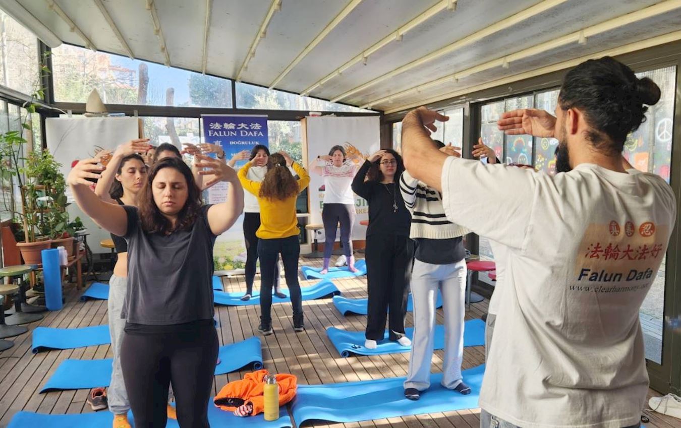 ![]() 图2:二零二四年三月十日,法轮功学员在伊斯坦布尔(Istanbul)卡德柯伊(Kadıköy)的生态生活中心举办法轮大法介绍会。图为到场的人们在学炼功法。 |