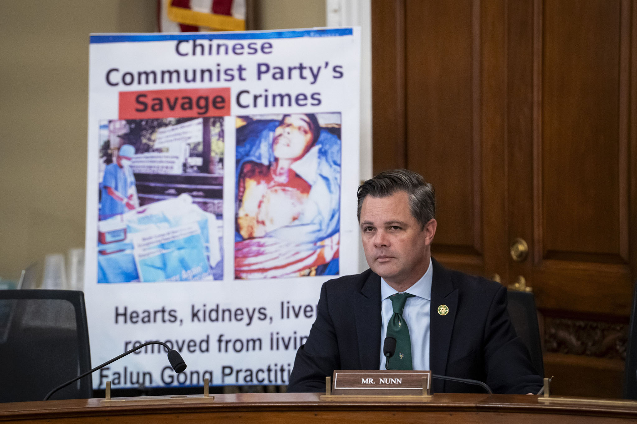 美国爱荷华州联邦众议员扎克·纳恩(Zach Nunn)在听证会上指着自己身后的法轮功学员在游行中打横幅的照片,横幅用英文写着“仍在进行的中共活摘法轮功学员器官的血腥暴行”。