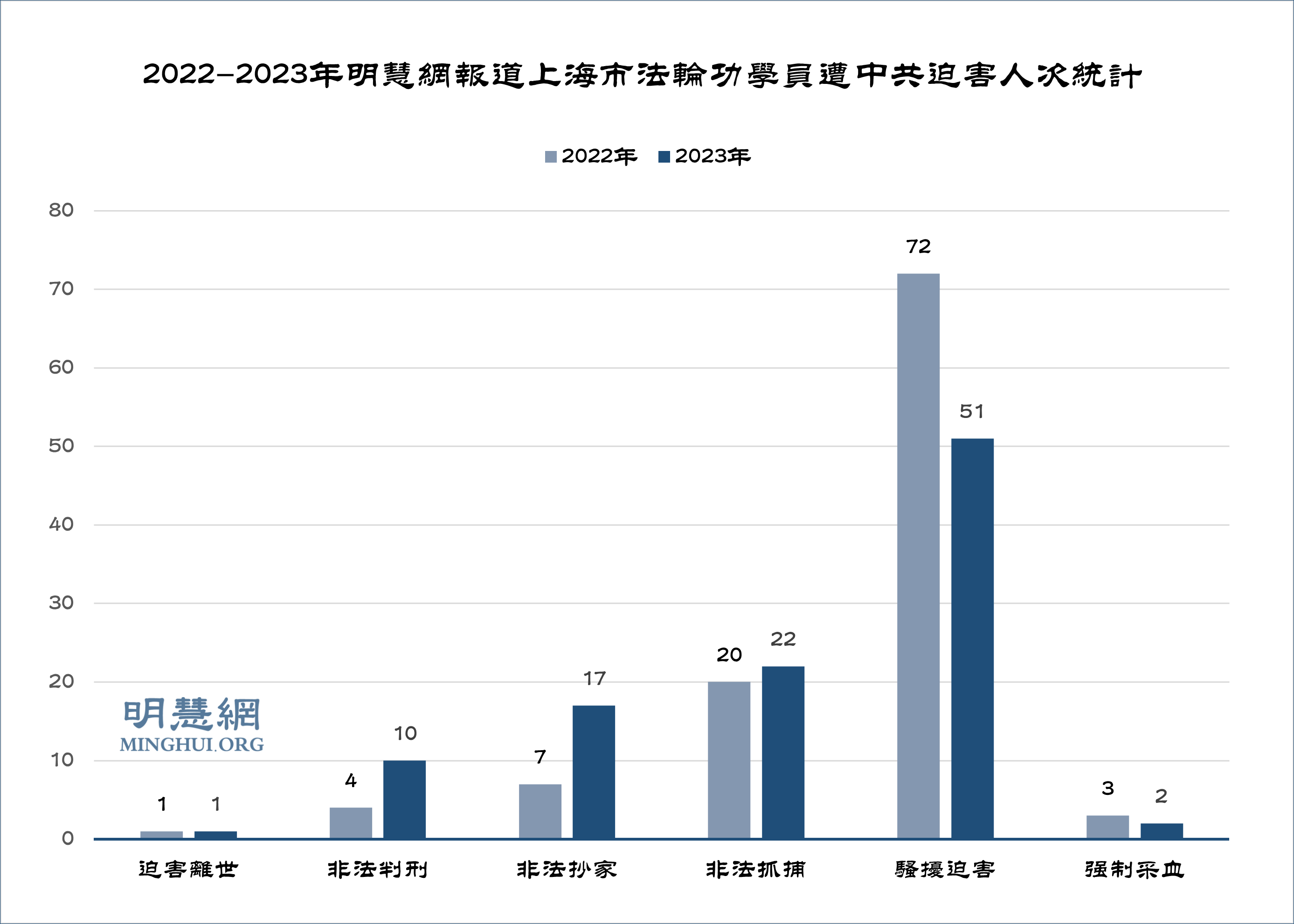 ![]() 图1:2022-2023年明慧网报道上海市法轮功学员遭中共迫害人次统计 |