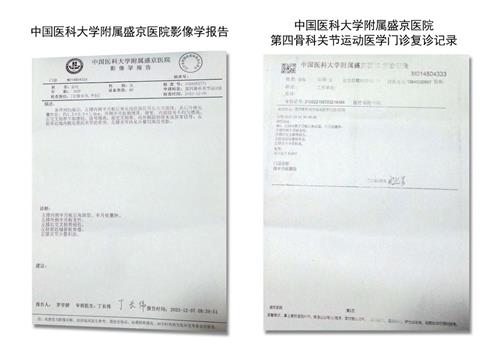 家人要求给我做伤情鉴定,狱警只是把我领到监狱城里的新康医院拍了个什么都看不出来的CT片子,然后拿着这个片子到辽宁大学司法鉴定中心作了一个所谓的鉴定报告。鉴定中心的大夫说:“看片子,轻伤害都够不上。”我说:“那做鉴定有什么意义?我现在这腿还疼呢,当时我的脸、身上都是伤……”大夫问:“那当时怎么不做呢?”检察官朱勇劝我说:“你听我的,做吧,然后该看病看病。”监狱和检察院联手欺骗我和家人,毫不负责的走个流程以尽早结案。