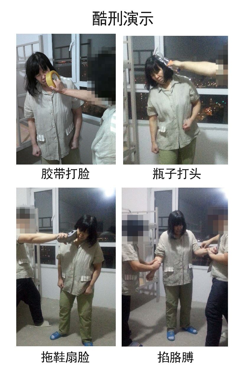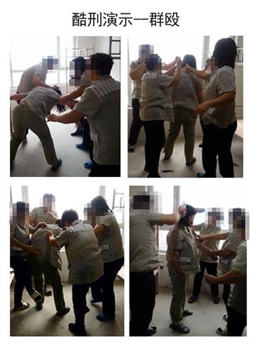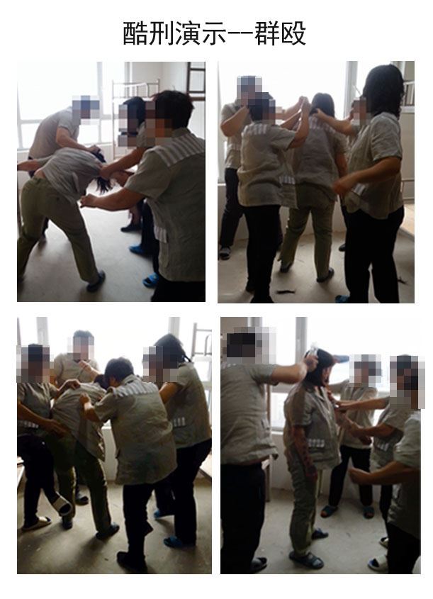 她们硬把我拖到窗户那儿,然后开始对我进行疯狂群殴,拳打脚踢,用拳头哐哐打,扇嘴巴子。参与迫害的犯人有许芸霞、高蔚蔚、王燕、李雪、杨阳等。李雪连续打嘴巴,一边打一边戏弄的问:“疼啊?”犯人何婷婷不是这屋的也过来打,这几个人上来轮番打,打一通,然后就逼迫我认罪悔罪、签字。我不配合,拒绝签字,她们就继续打。