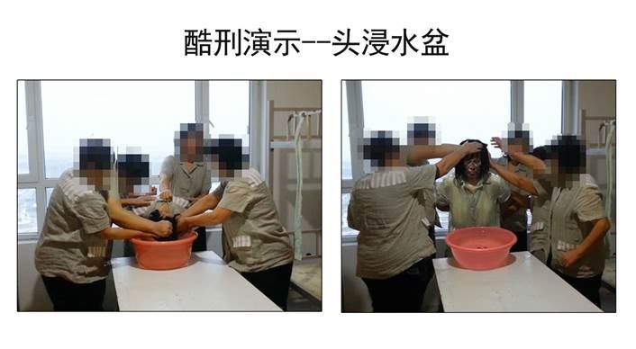 陆艳清一看我还是不妥协,就气急败坏地说:“不行,今天必须得拿下!”她就选了一个大号塑料盆,到水房接回来一满盆的水,把桌子拽到我身前,水盆放在桌子上,把我双手反绑到后边,这时我双腿仍是劈开、绑在床腿上的姿势。四、五个犯人上来,狠劲将我的头摁到水盆里,先听到“咕噜咕噜”声,过一会儿等没动静了,后面一个人再使劲把我的头拽出来。我刚喘了一口气儿(有时还没等我喘气)就再次被她们摁到水盆里,看我快挺不住了就再拽出来,反复如此,我被她们野蛮折磨了二十多分钟,几次差点窒息、呛死。