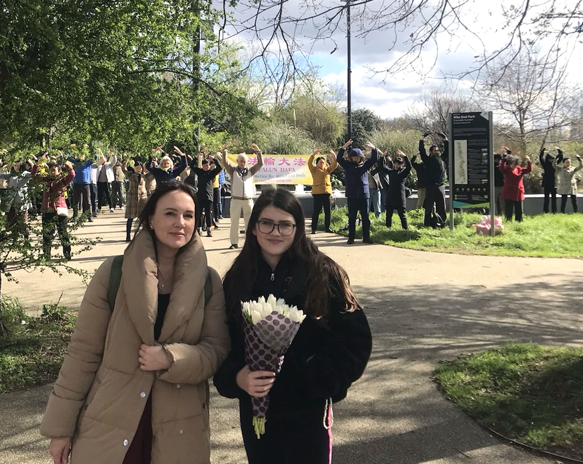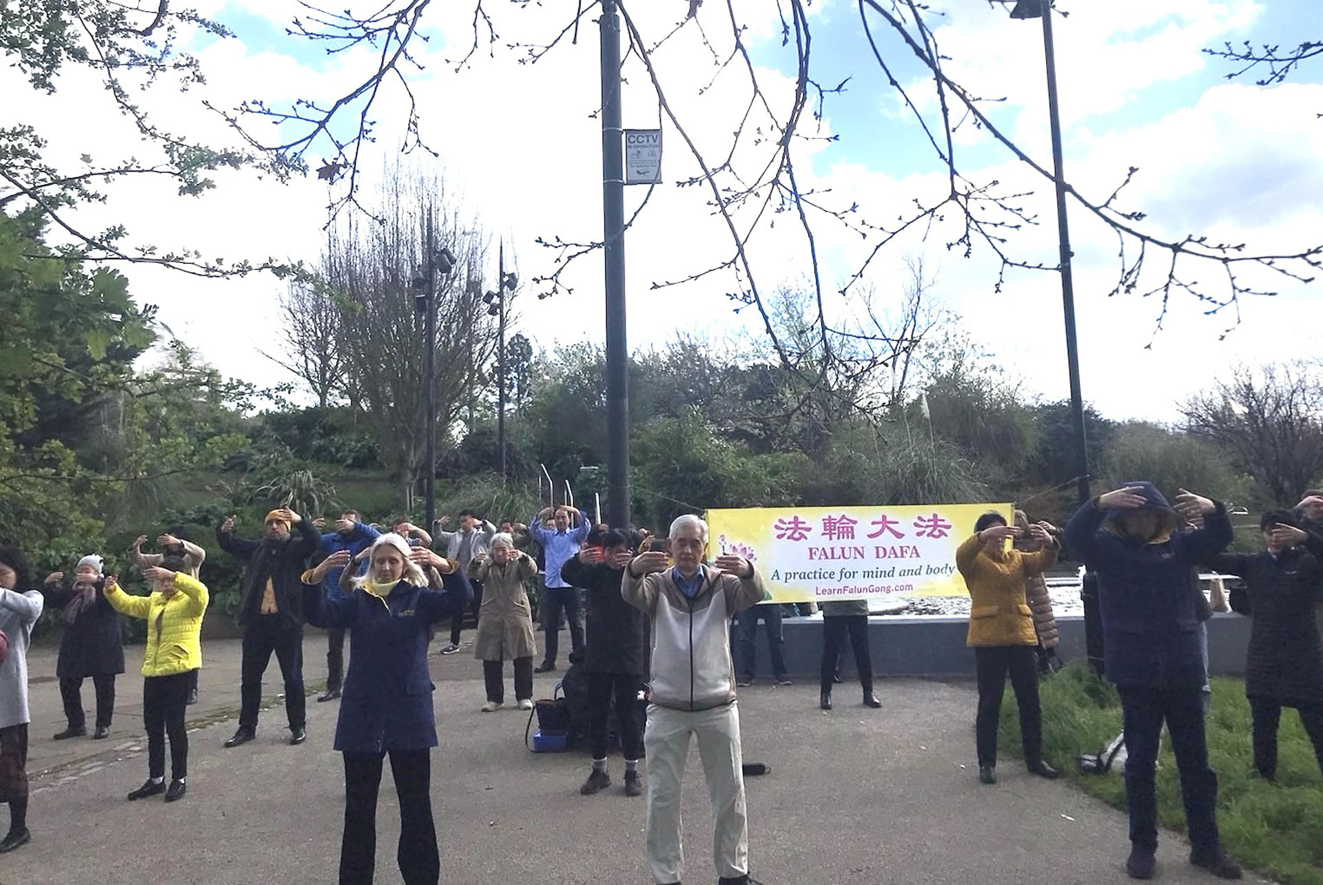 ![]() 图1:三月二十四日星期天,英国学员在东伦敦公园集体炼功 |