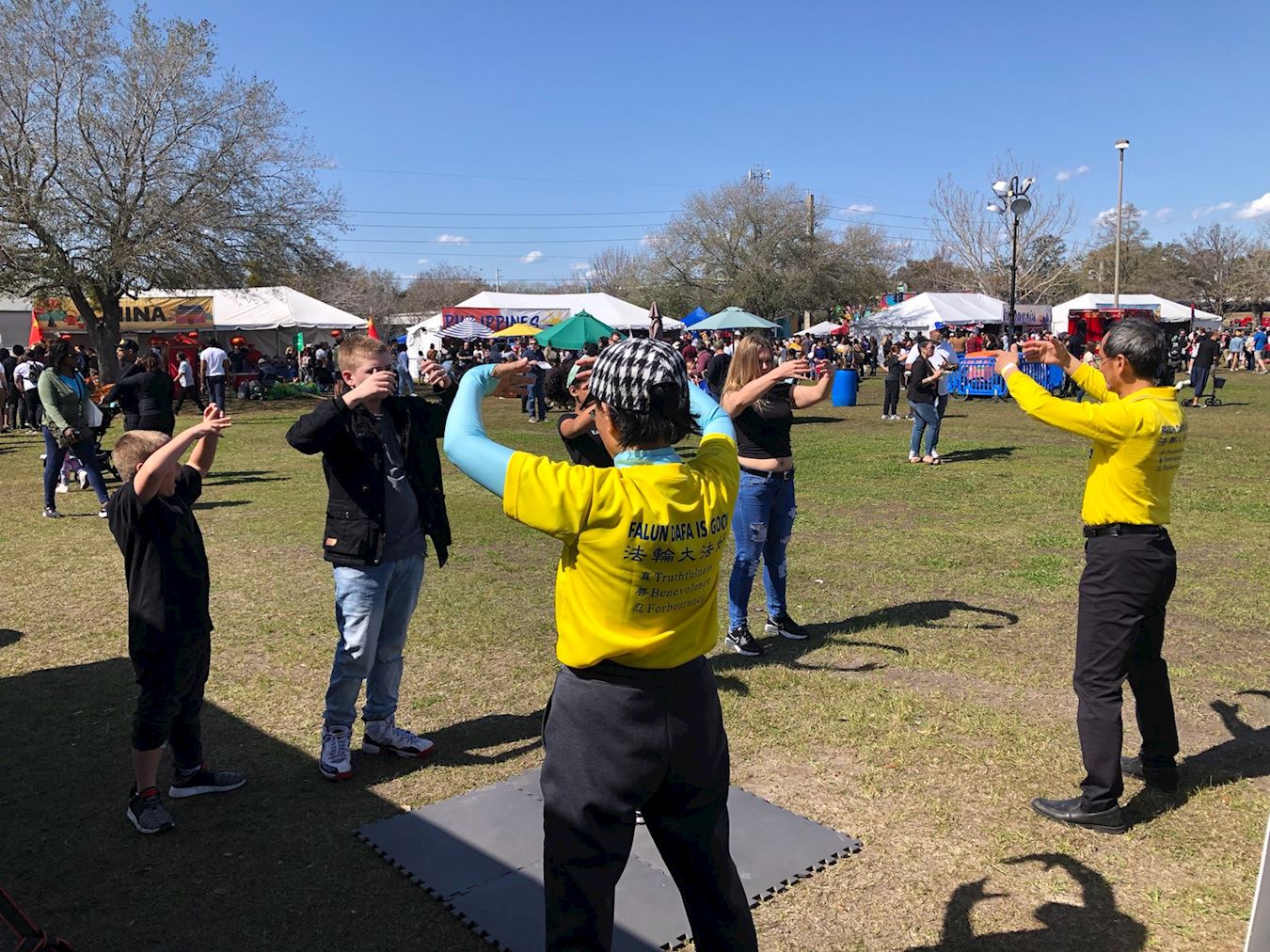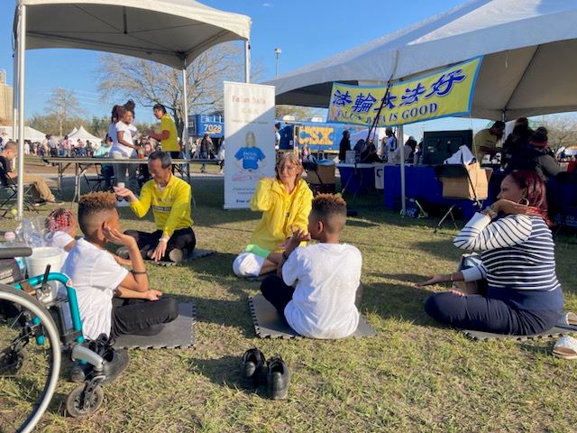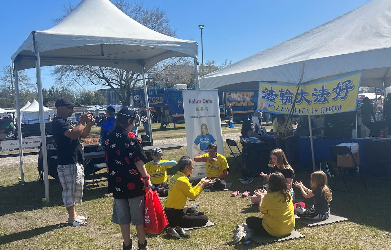 法轮功学员的展位位于非营利组织专区,在喧嚣之中,这里是一片宁静祥和的绿洲,吸引众人纷纷驻足。当他们看到学员炼舒缓祥和的五套功法时,许多人都想当场学功。学员们还发放真相传单,向大家介绍中国正在发生的迫害和活摘器官的罪行。