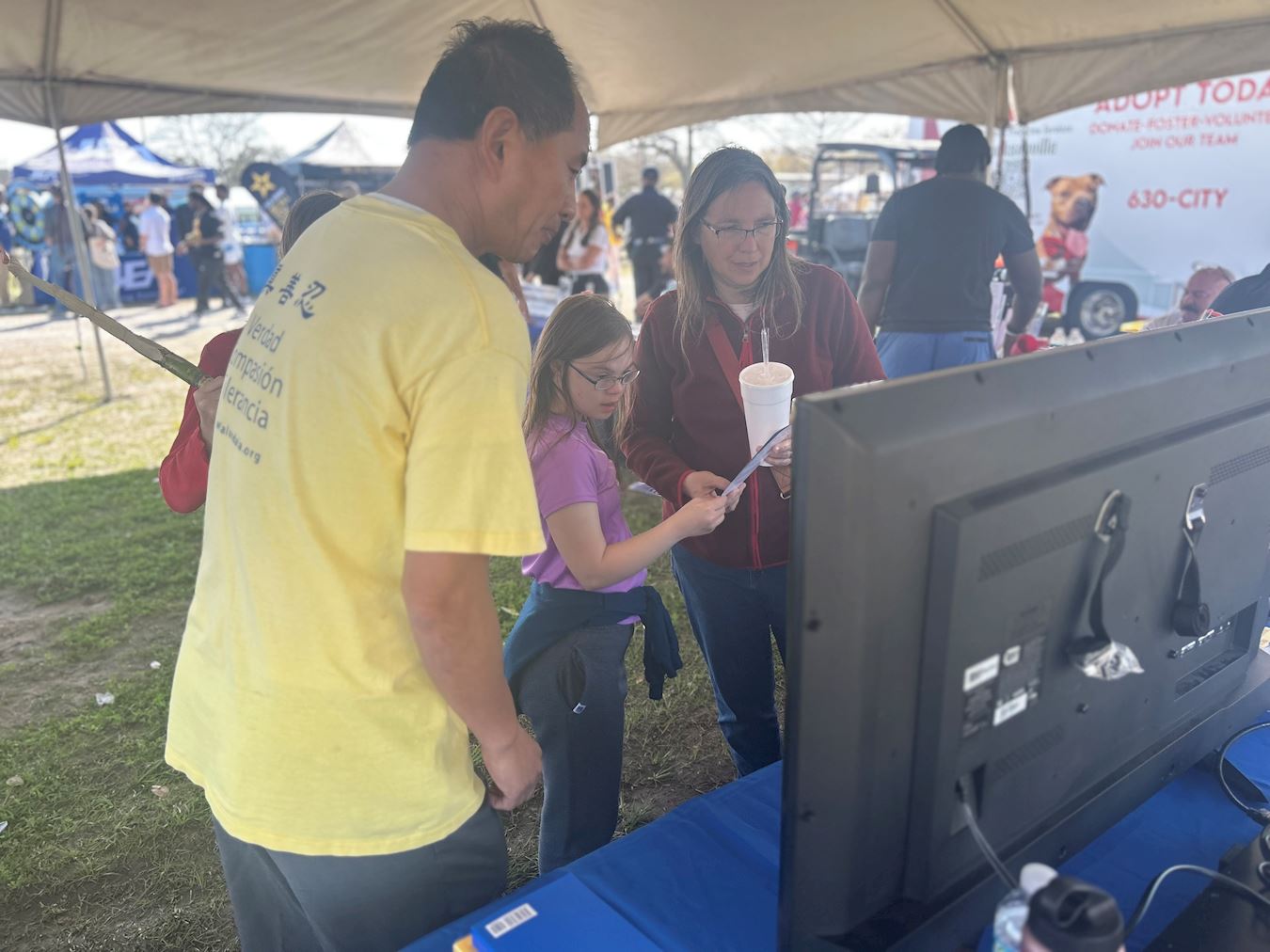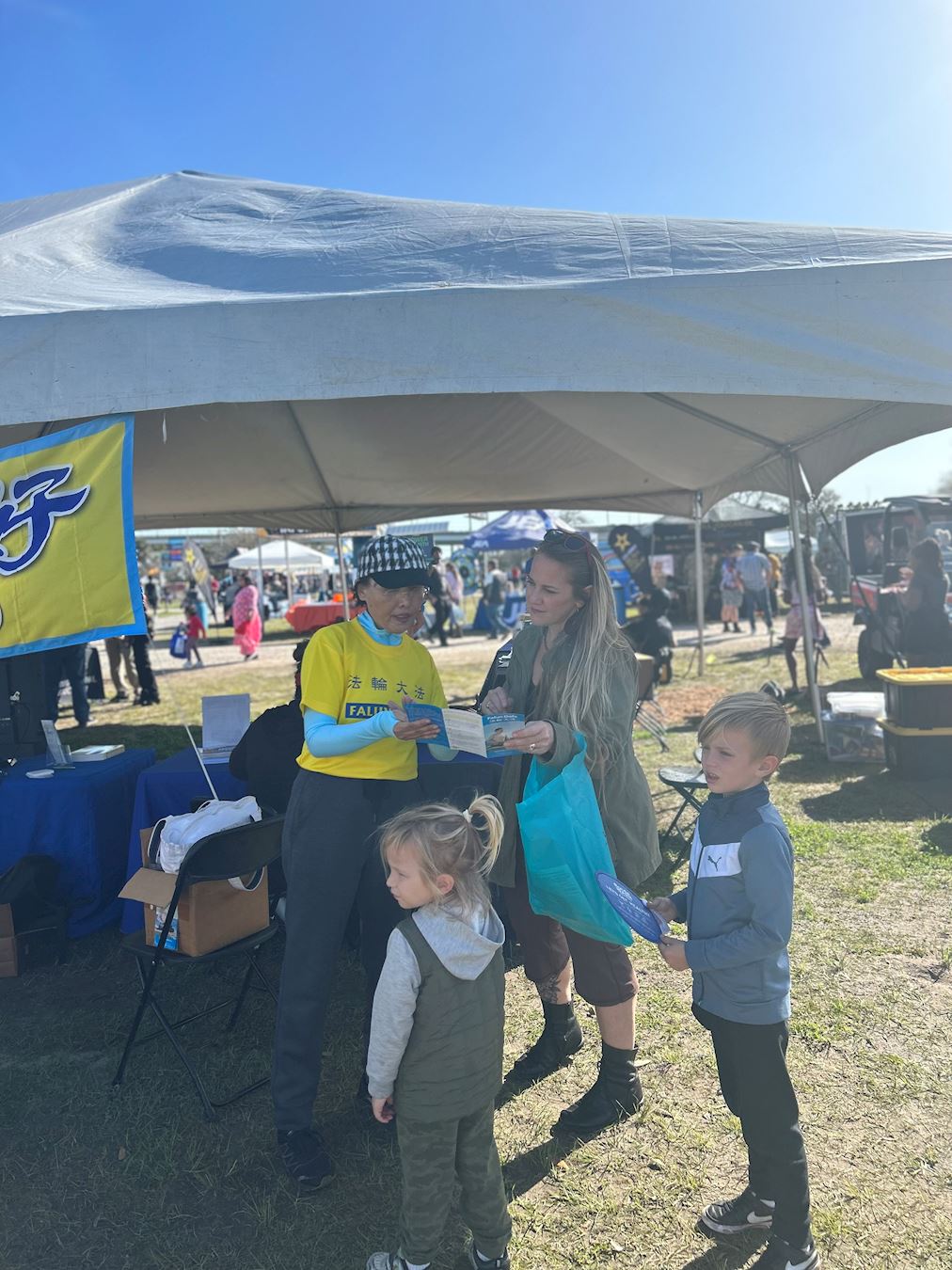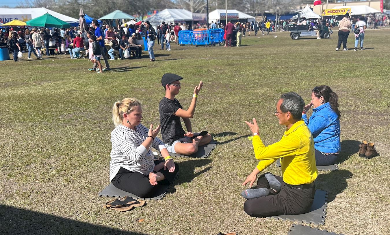 一对来自另一个非营利展位区的夫妇也对修炼表现出兴趣。学员向他们解释什么是法轮大法,这位女士不断地说:“这是我想要的!”随即她也加入学炼打坐。