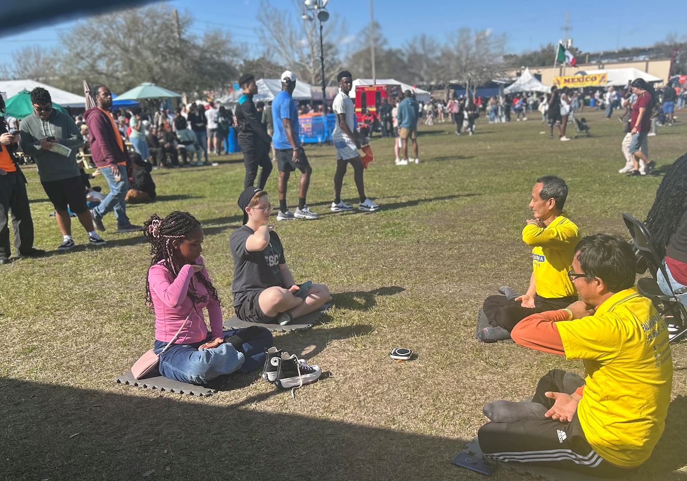 两个女孩走到展位前,询问在哪里可以学习法轮功,学员告诉她们现场就可以学炼时,女孩们非常兴奋,立刻开始单盘打坐。