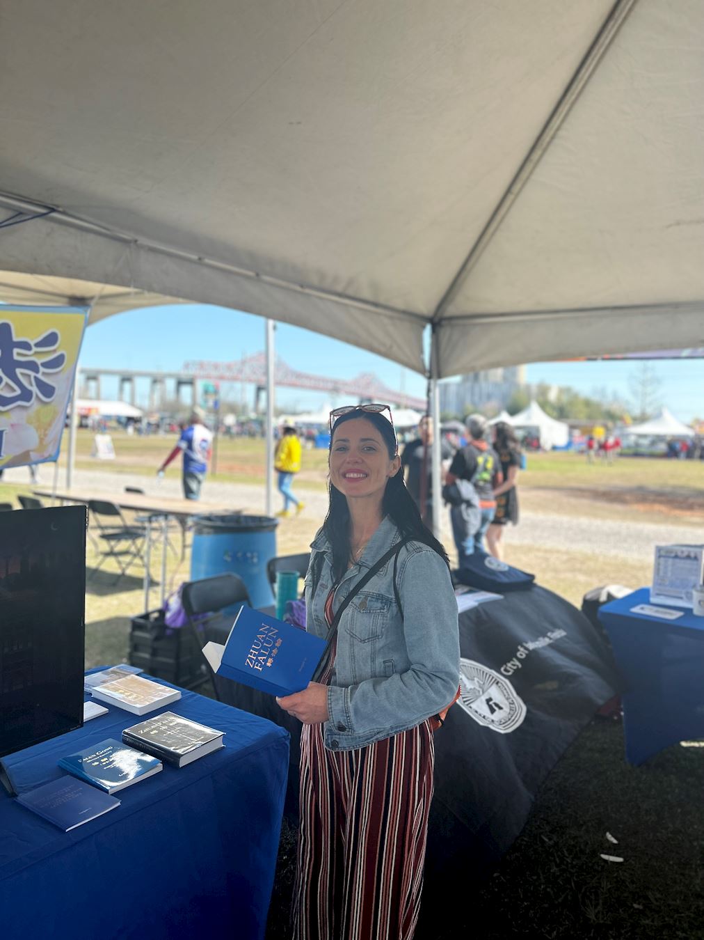 一位带着灿烂微笑的年轻女士走到展位前说:“我看过神韵演出,对法轮大法非常感兴趣。我真的很想阅读这本书(《转法轮》)!”当得知这本书可以在网站上免费下载,也可以在线订购, 她听了很高兴。