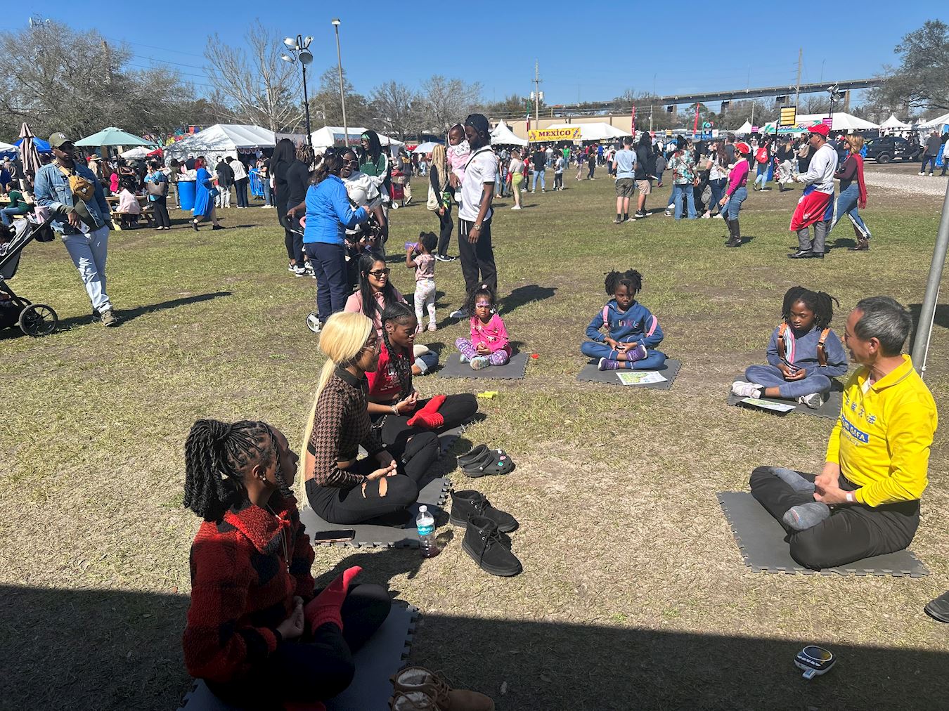 一个有四个孩子的家庭也停下来学炼法轮功,随着越来越多的人加入,学员们准备的垫子都发完了。