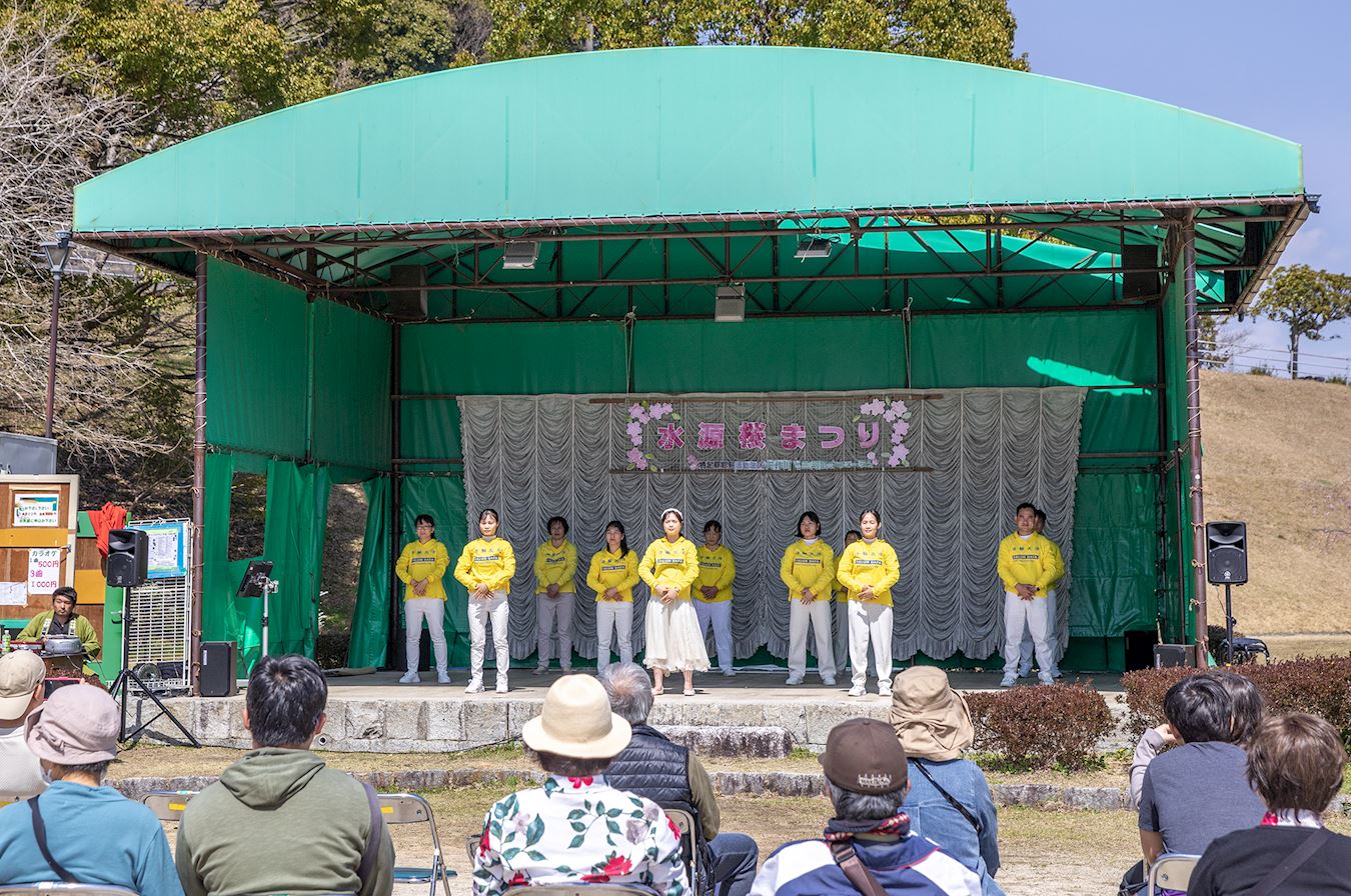 ![]() 图6~7:在丰田市水源公园樱花节的舞台上,法轮功学员们展示功法。 |