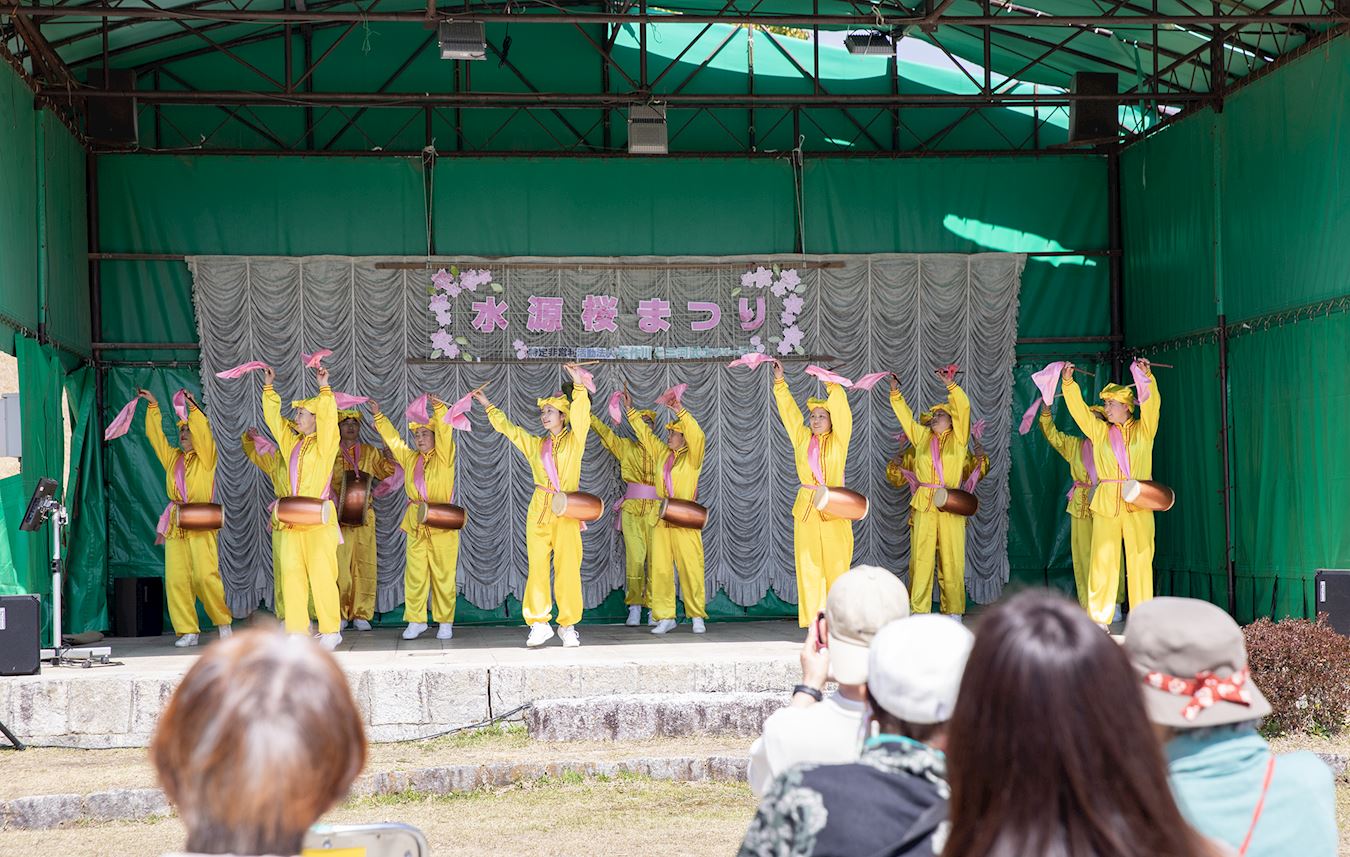 ![]() 图8~9:在丰田市水源公园樱花节的舞台上,法轮功学员们在表演腰鼓。 |