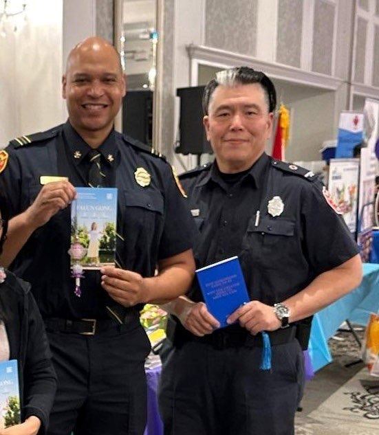 ![]() 图1~2:警察们来法轮大法展位留影,表达对功法的喜爱与赞同。 |
