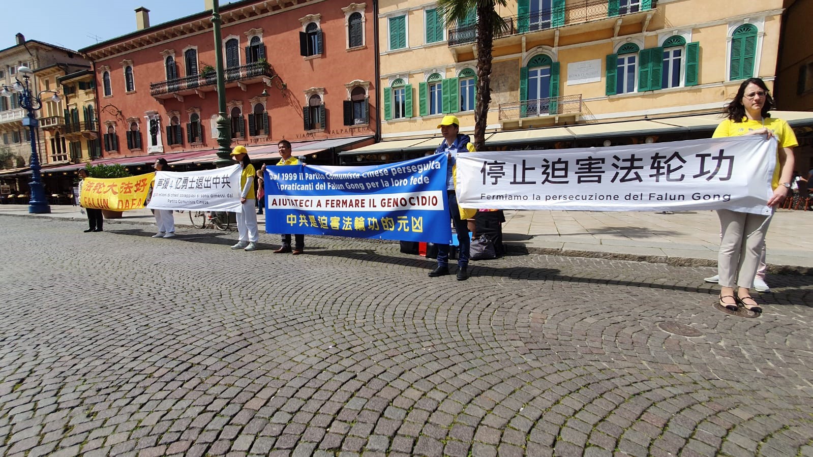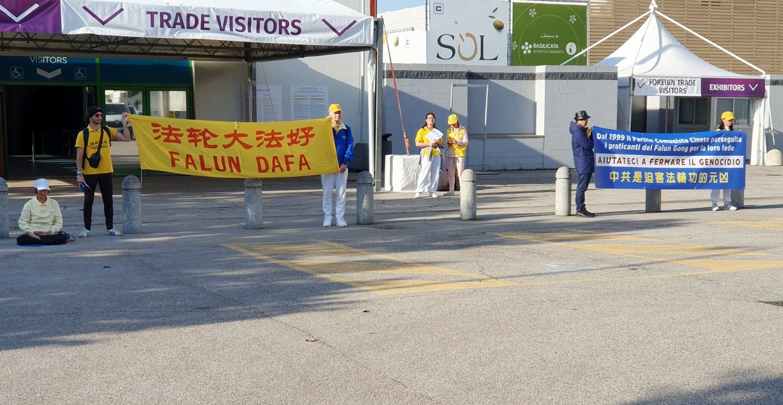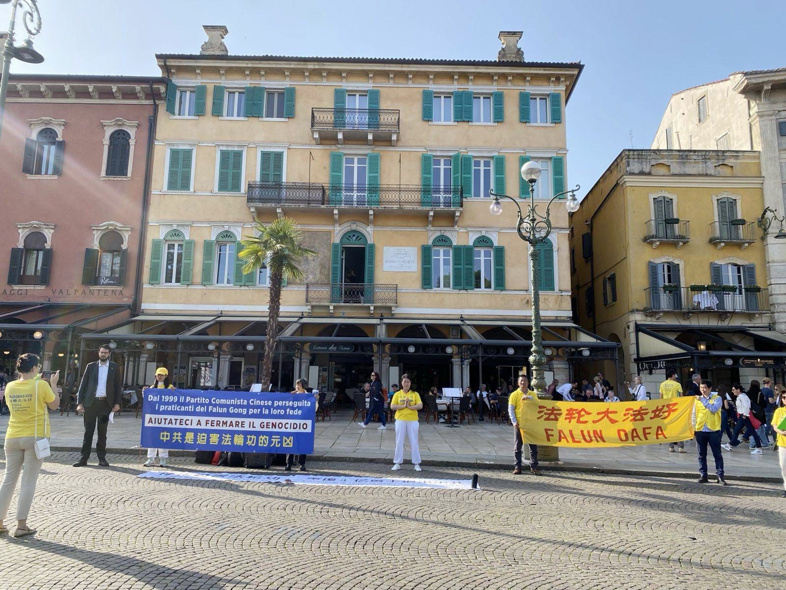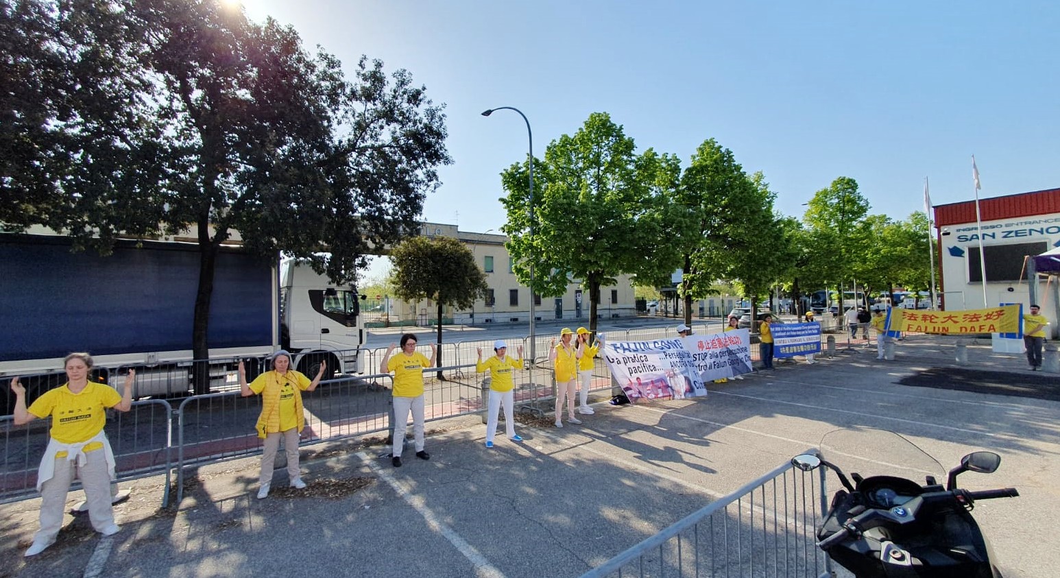 四月十二日星期五,在有中国代表团参加的维罗纳博览会会场外,意大利法轮功学员组织了第二场活动,向参加博览会的场内外人员讲真相揭露迫害。