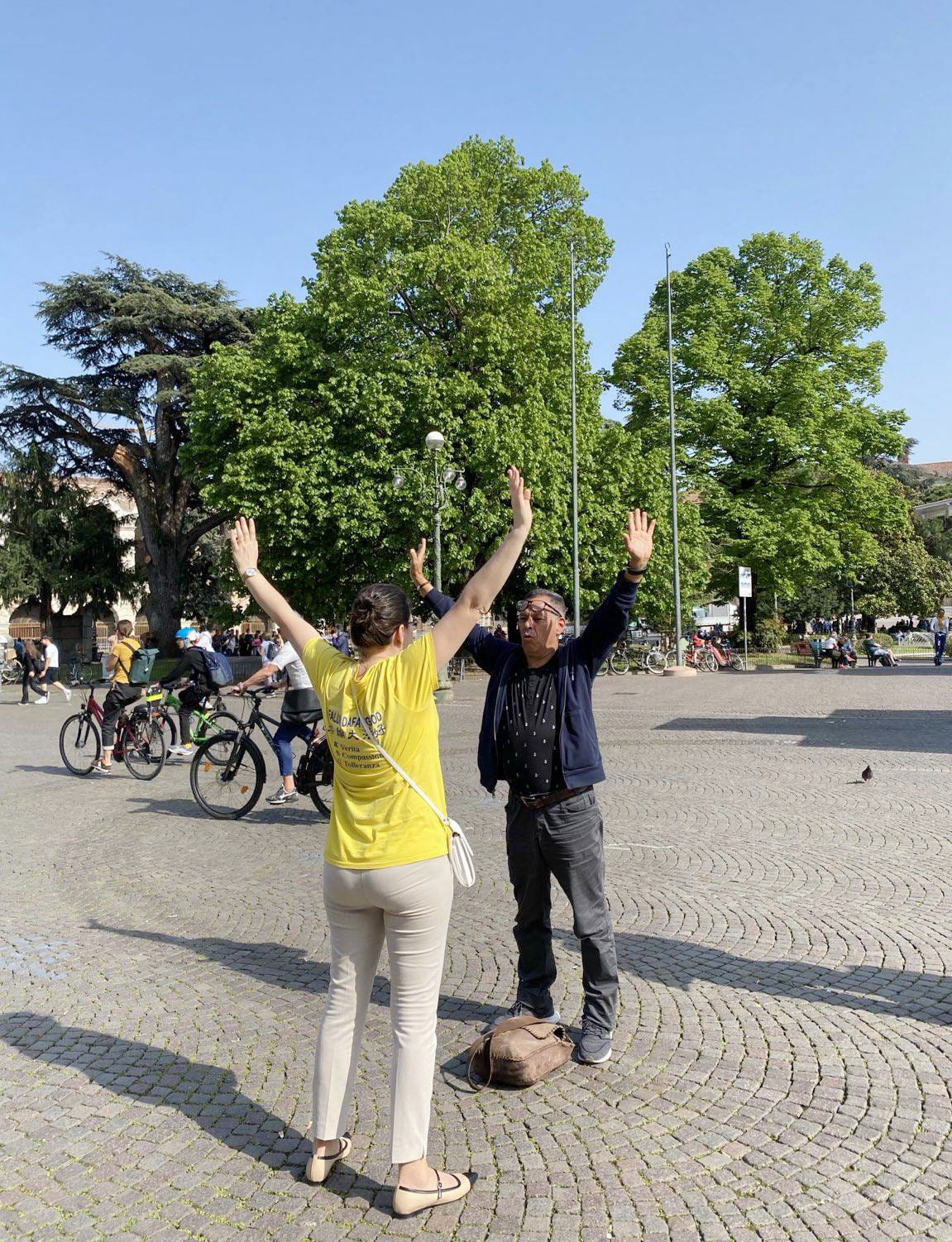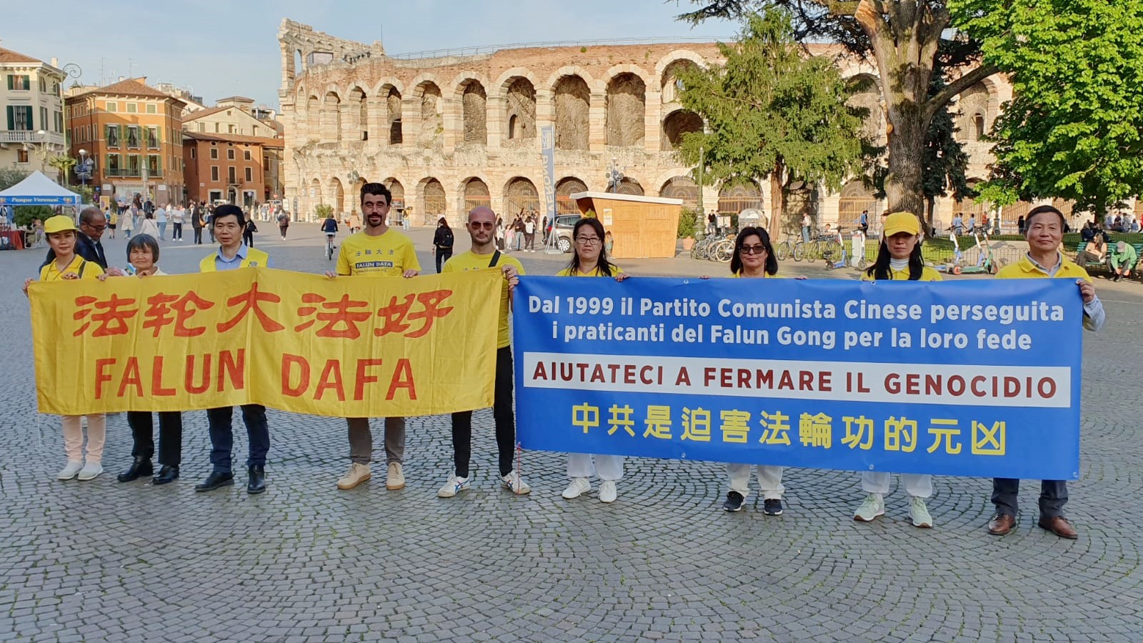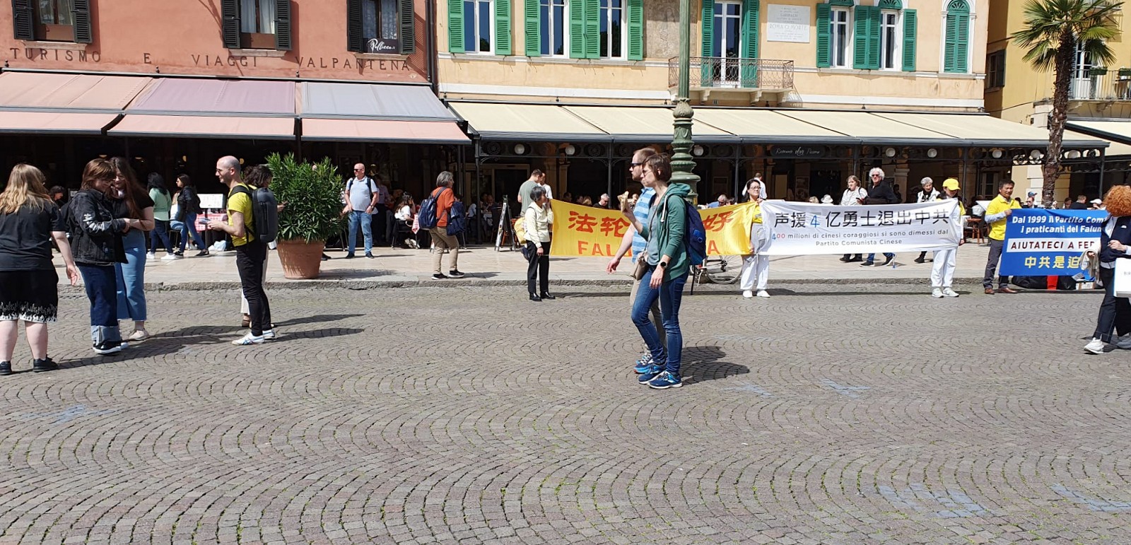 四月十一日星期四,在维罗纳旧城中心的布拉广场(Piazza Bra)法轮功学员展开“停止迫害法轮功”、“法轮大法好”等横幅。很多人被真相横幅的内容所吸引,驻足观看,纷纷前来拿取法轮功真相资料,有的与学员主动交谈,有的想了解更多关于法轮功的讯息,学员细致告知他们法轮大法在中国遭受迫害的真相。