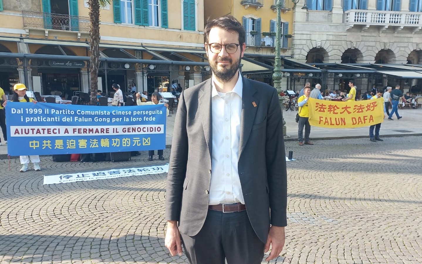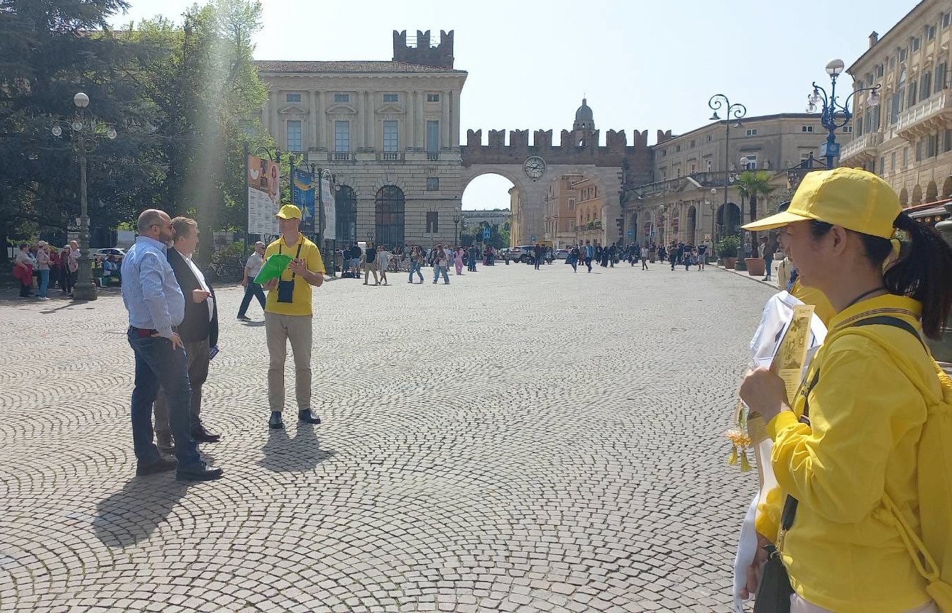 意大利国会前议员维托·科姆奇尼(Vito Comencini)来到活动现场表达支持和声援,他说:“我来这里是为了声援那些反对和谴责中国活摘器官和非法贩卖器官的志愿者(法轮功学员),我在众议院时有幸在罗马见到了这些志愿者。我理解并赞赏他们正在进行重要的文明和自由而努力,这就是为什么我决定今天在维罗纳度过,以给予他们声援。”