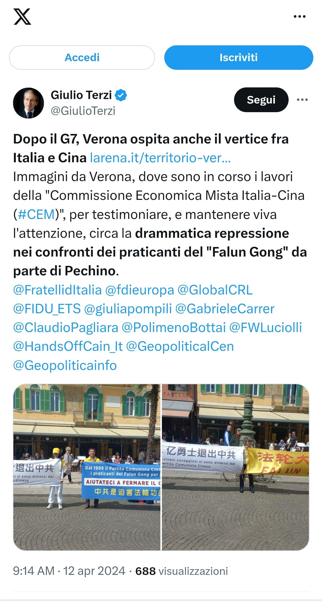 ![]() 图5:前外交部长、前大使,现参议员朱利奥·泰尔齐(Giulio Terzi)先生也在推特上发帖,提醒人们关注法轮功所遭受的迫害。(推特截图) |