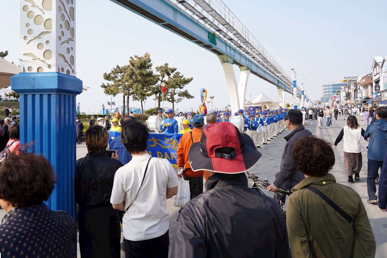 随后,法轮功学员组成的天国乐团还在仁川月尾岛文化街举行了游行活动,吸引了大批游客观看。法轮功学员在游行活动中,沿路派发法轮大法简介,并讲述修炼大法的美好。
