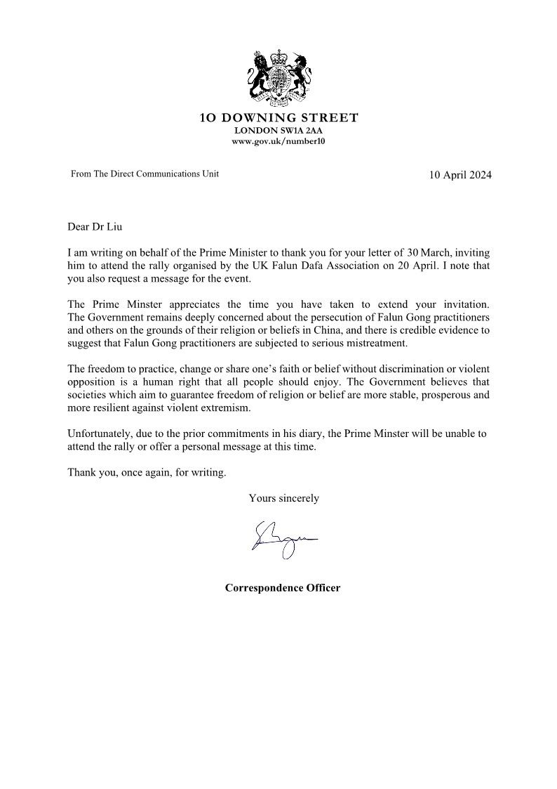 里希·苏纳克(Rishi Sunak)首相办公室的来信说:“我代表首相感谢你们三月三十日的来信,邀请他参加四月二十日由英国法轮大法学会组织的集会。