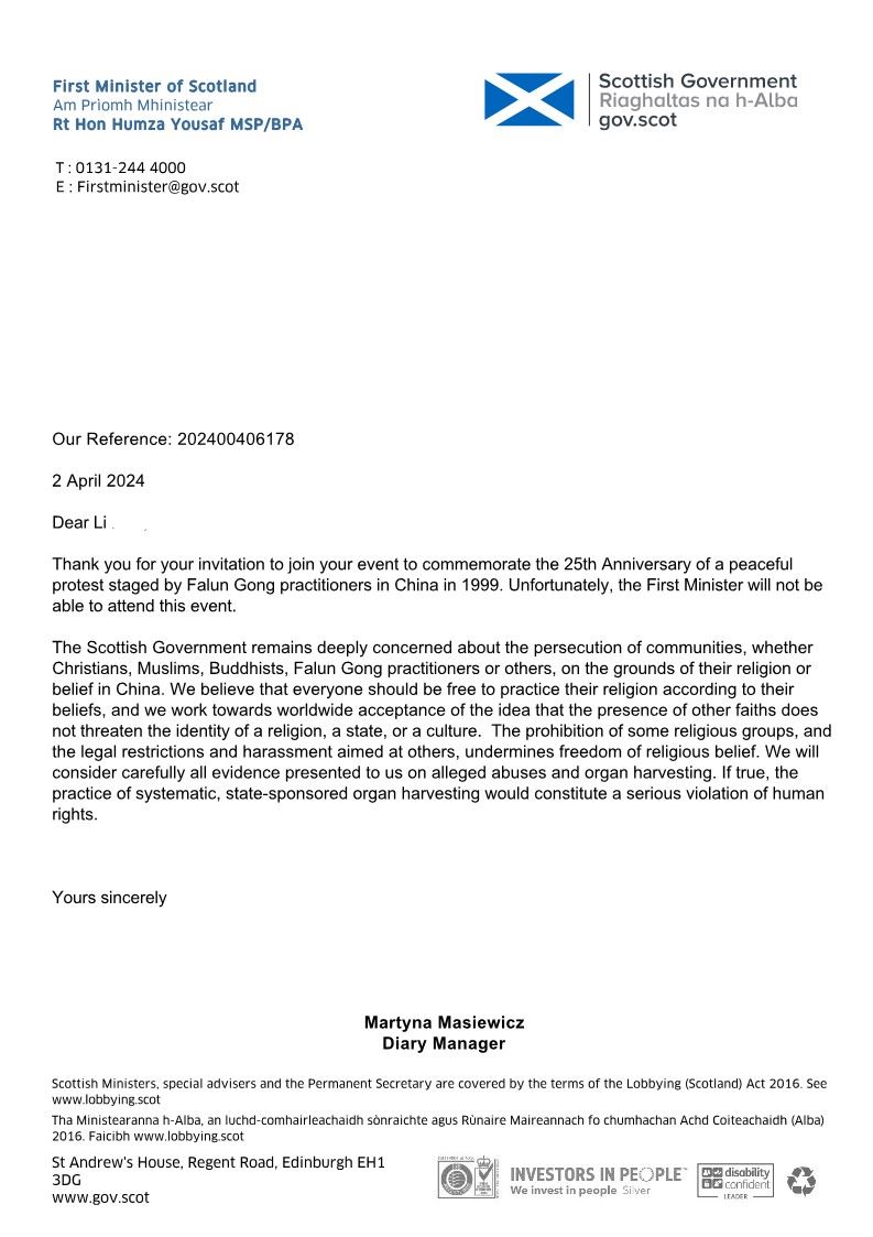 苏格兰首席部长 Rt Hon Humza Yousaf MSP的办公室也来信支持,信中说:“苏格兰政府对中共以宗教或信仰为由,对基督徒、穆斯林、佛教徒、法轮功学员,或其他社会群体的迫害深感担忧。我们认为每个人都有权自由地奉行自己的信仰,并且要我们努力,促使在世界范围内接受这样一个理念,即其他信仰的存在并不威胁宗教、国家或文化。”