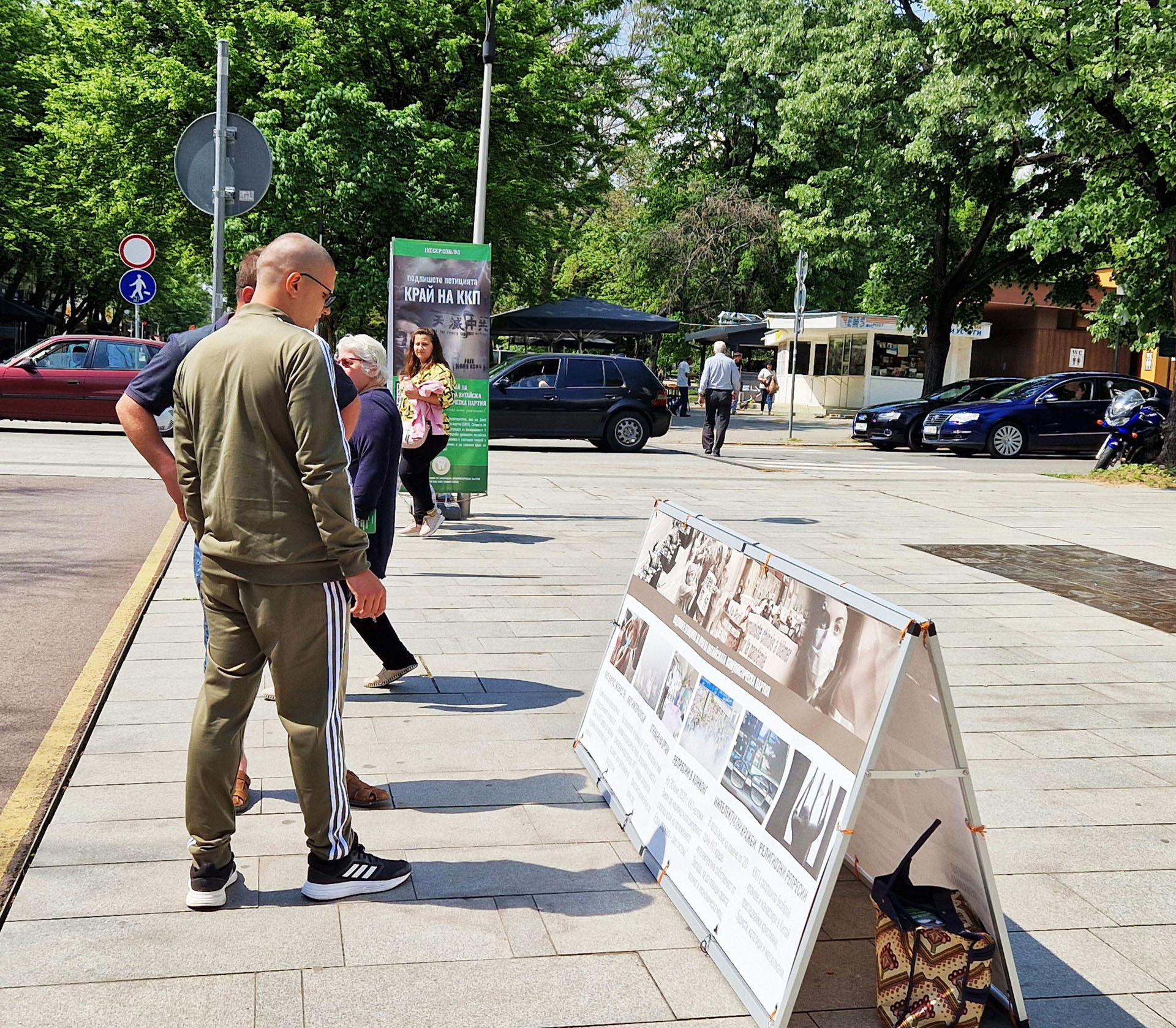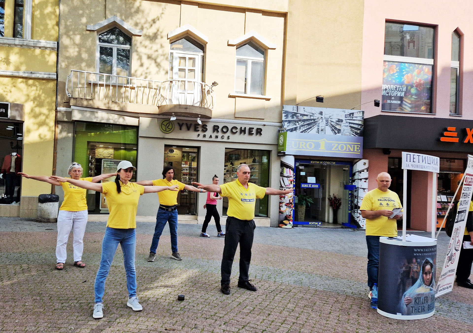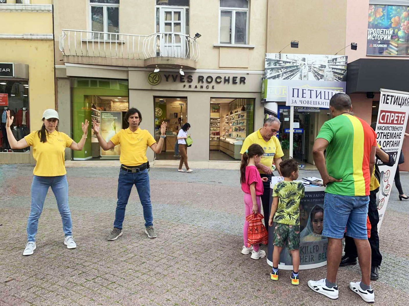 同一天,在保加利亚第二大城市普罗夫迪夫(Plovdiv),法轮功学员将真相亭设立在卡梅尼察楼梯前主要街道最热闹的地方。学员们向路人讲述举办此活动的目的,并展示法轮功五套功法,人们驻足观看,并拍照留念。