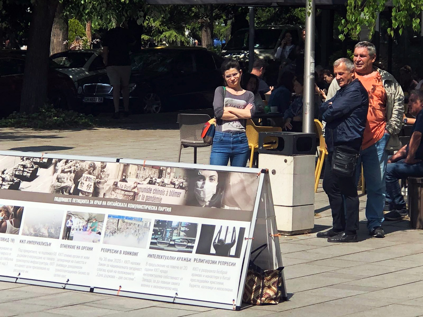 一群游客刚刚乘坐巴士到达旧扎戈拉,其中的一位女士看到横幅上关于中共暴力迫害的图片后,就从人群中走出来,找到学员了解更多的情况。