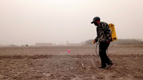 ![]() 甘肃省张掖市郊区一农民在田地里喷洒农药。 |
