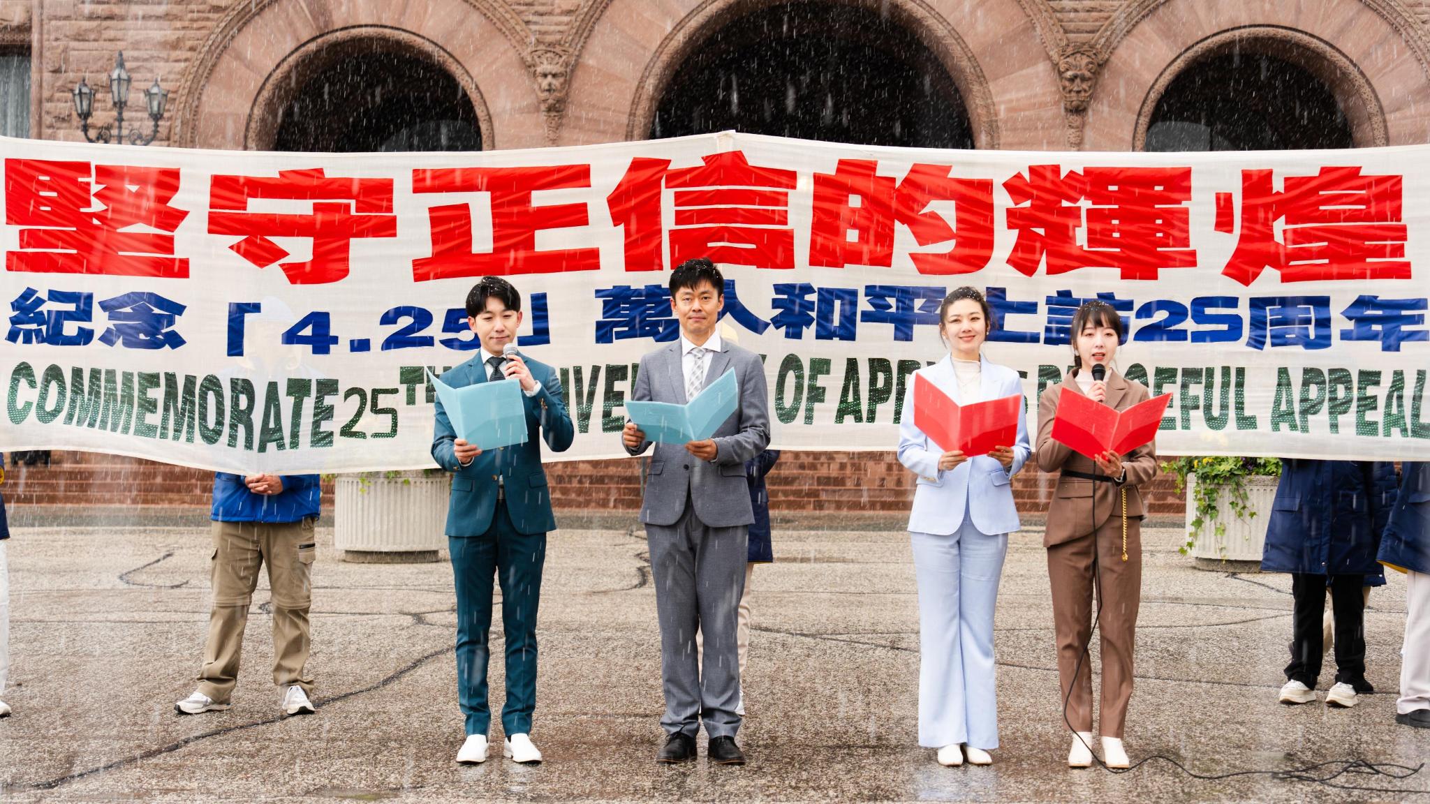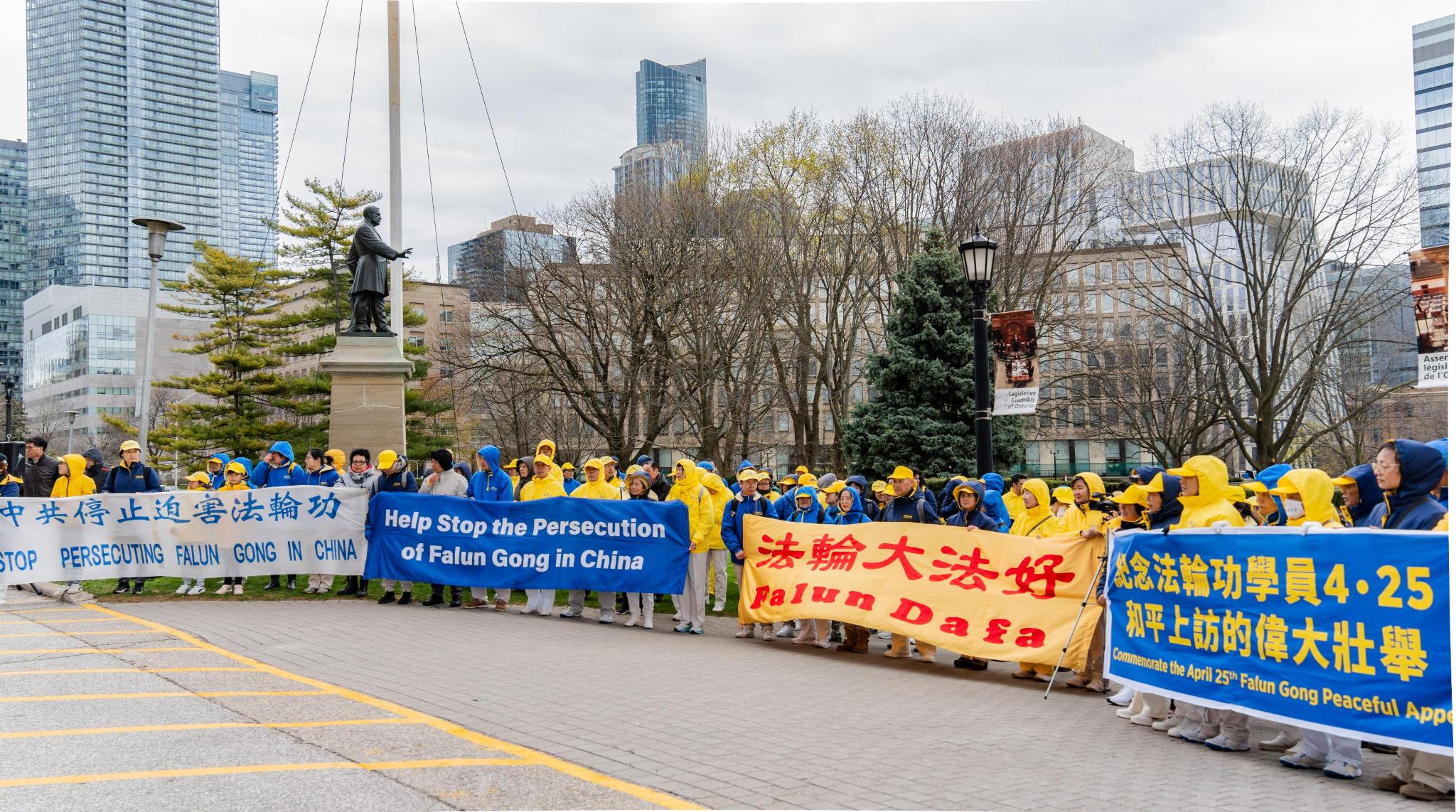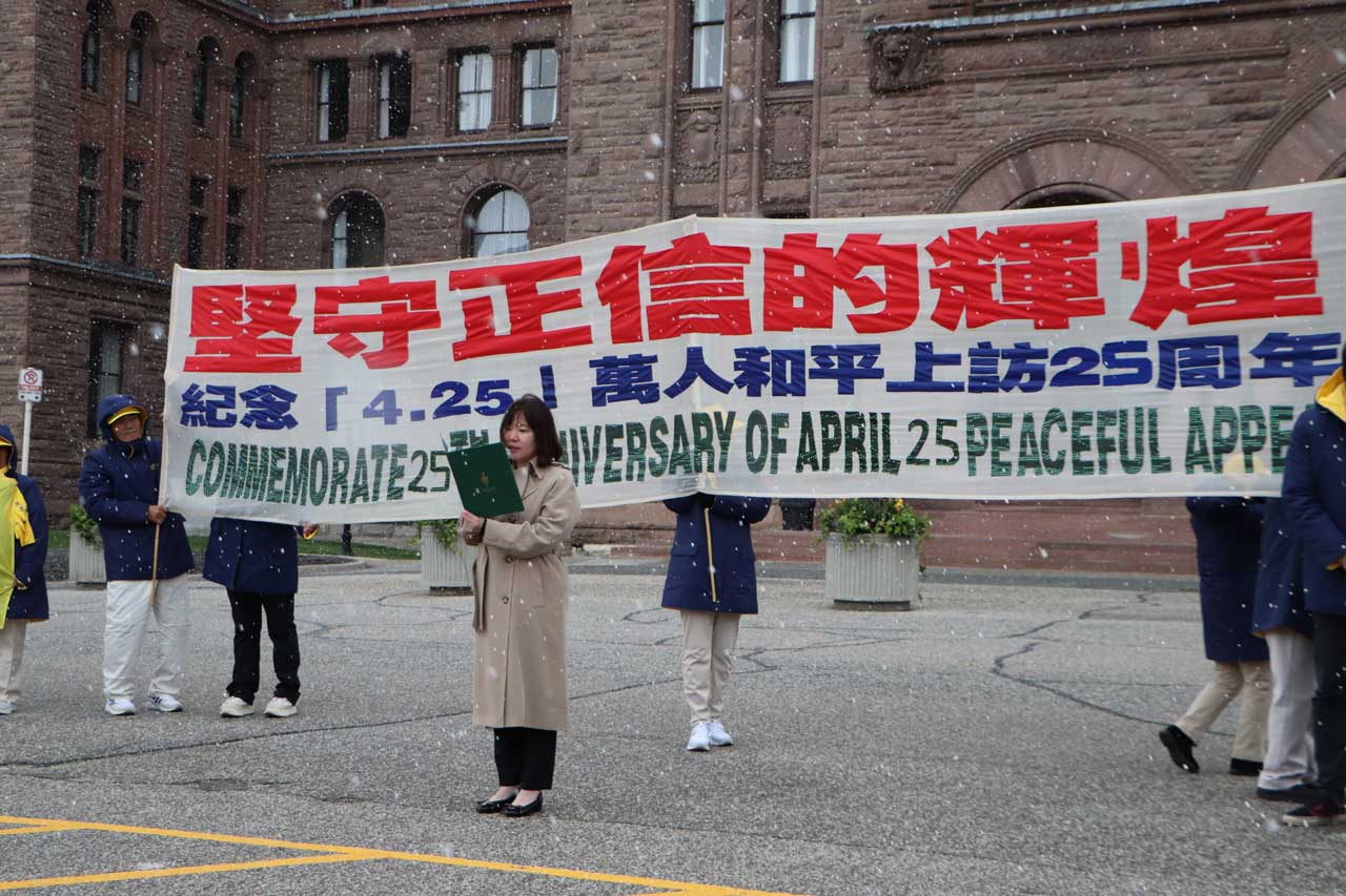 二零二四年四月二十日,为纪念“四·二五”和平上访二十五周年,加拿大多伦多法轮功学员在安大略省政府前的皇后公园举行了大型集会。集会时,天空下起了又急又大的雪和冰雹,冰雪中,一些社会知名人士到场发言,敬佩法轮功学员当年展现的良心和勇气,并谴责中共二十五年来不断迫害法轮功。
