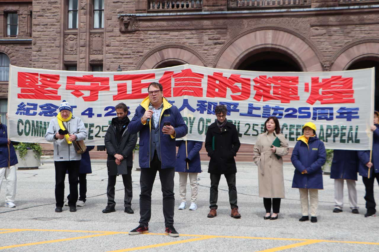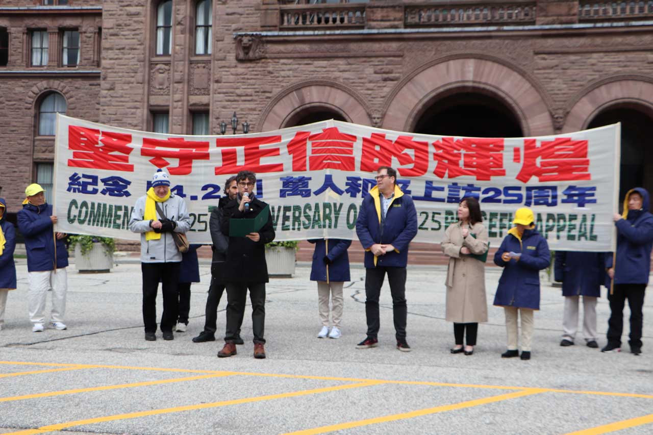 迪恩谈到:“捍卫言论自由和宗教自由的承诺明确地写在中国宪法中。然而,中国共产党选择忽视,而且持续忽视今天我们对任何言论或宗教自由的表达。从‘四·二五’请愿发生的那一天起,中共就镇压并试图消灭你们所有人。你们的精神和毅力是如此令人欣赏,应该得到每个加拿大人的接纳和支持。作为一名出版行业者,我敬佩你们的奉献,我与你们所有人同在。”