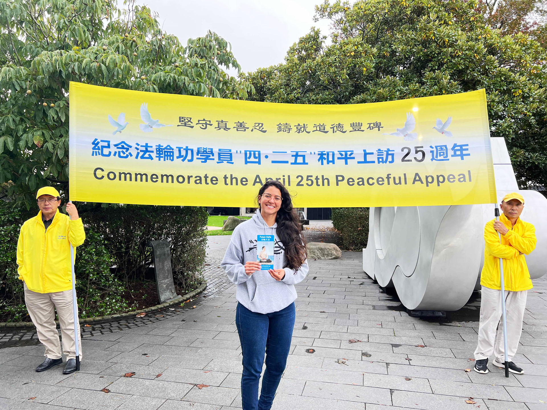 来自巴西的蕾莎(Raissa)是一名私人健身教练,她就在附近工作,经常在这里见到法轮功学员炼功。她说:“他们总是给人留下很深刻的印象。我能感觉到功法中的意义和益处,比我们肉眼看到的更加深远。”