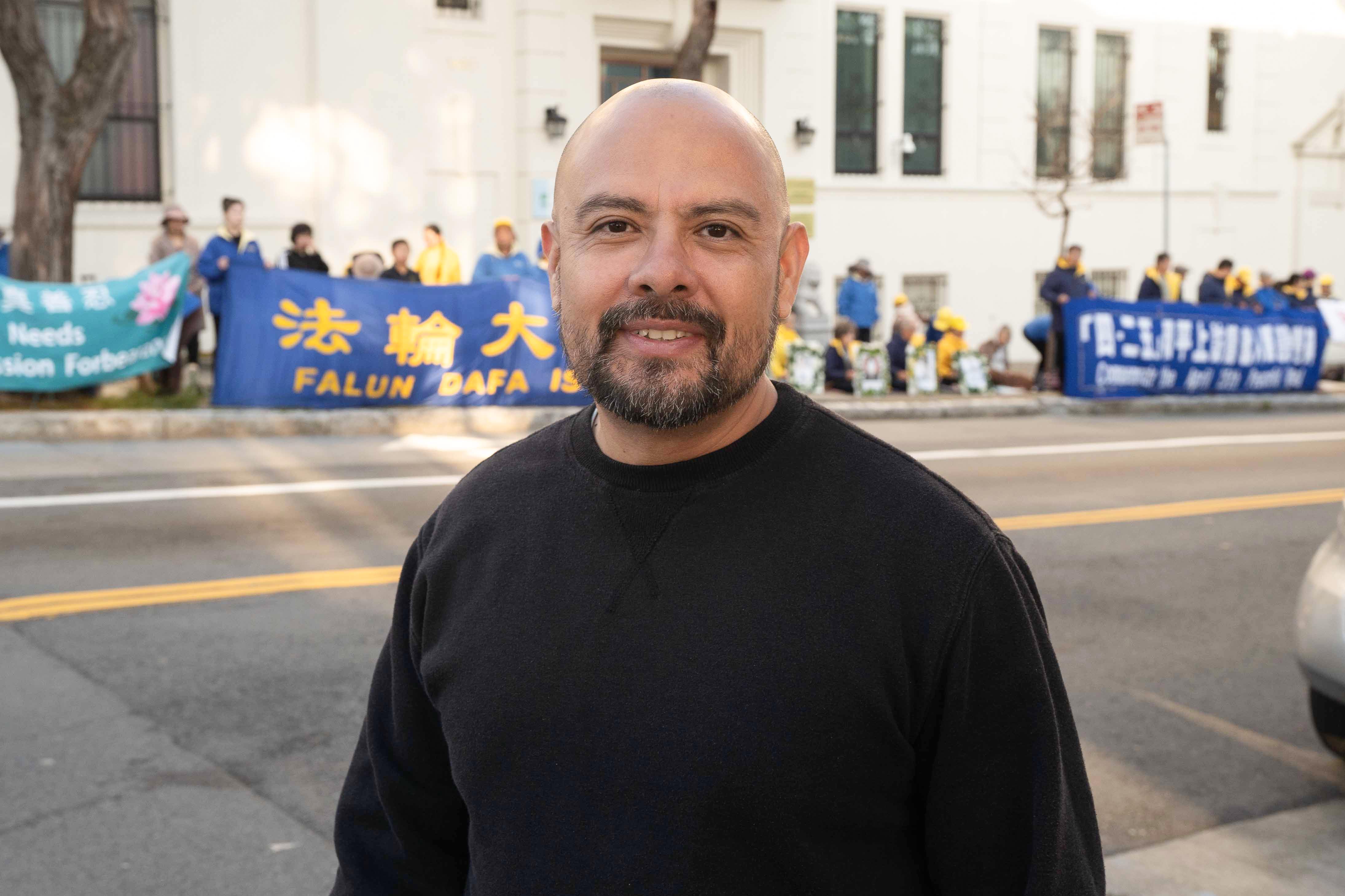 在湾区圣马刁县校区任职的马可(Marco)表示,他练瑜伽,他喜欢法轮功的打坐功法,“打坐可以帮助缓解压力,保持头脑清醒。遵循真、善、忍的原则非常重要,我们需要这个原则。迫害是不对的,人们应该有思想自由,信仰自由。”