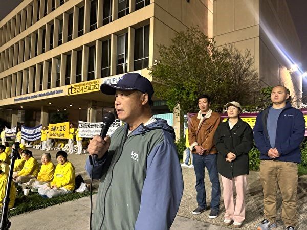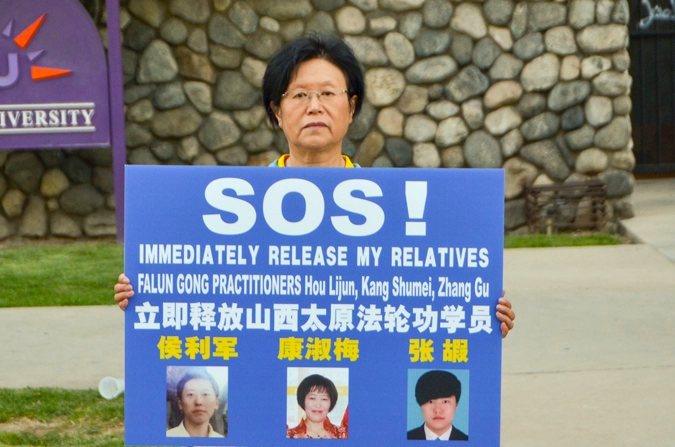 洛杉矶的法轮功学员康女士(Karen Kang)在集会上说,去年四月二十五日,她的外甥侯利军因修炼法轮功被山西省太原市万柏林区小井峪派出所两名警察无辜绑架。在一年的非法关押期间,侯利军在看守所遭受野蛮灌食、不让睡觉、打耳光、强行转化等残酷迫害。
