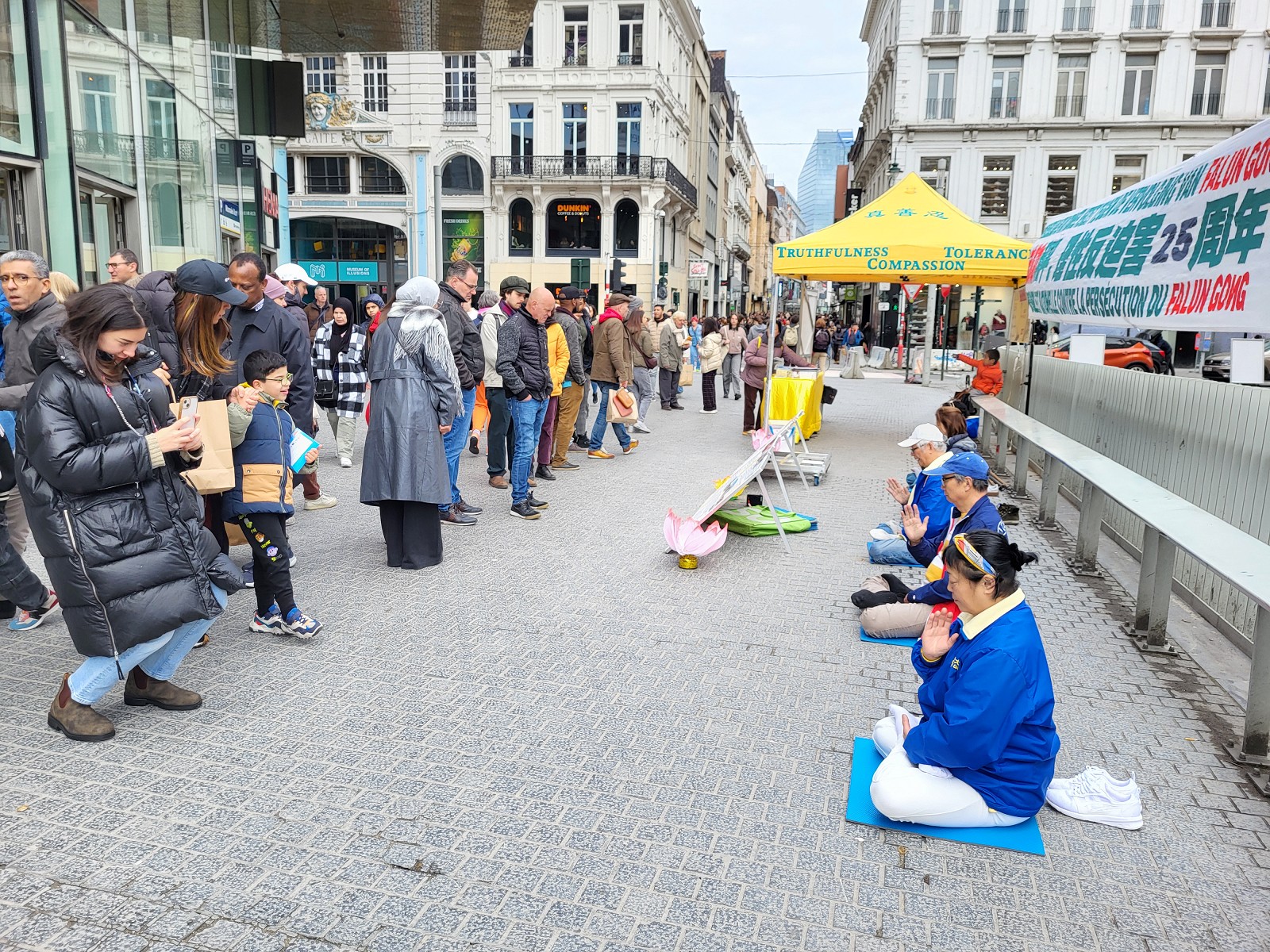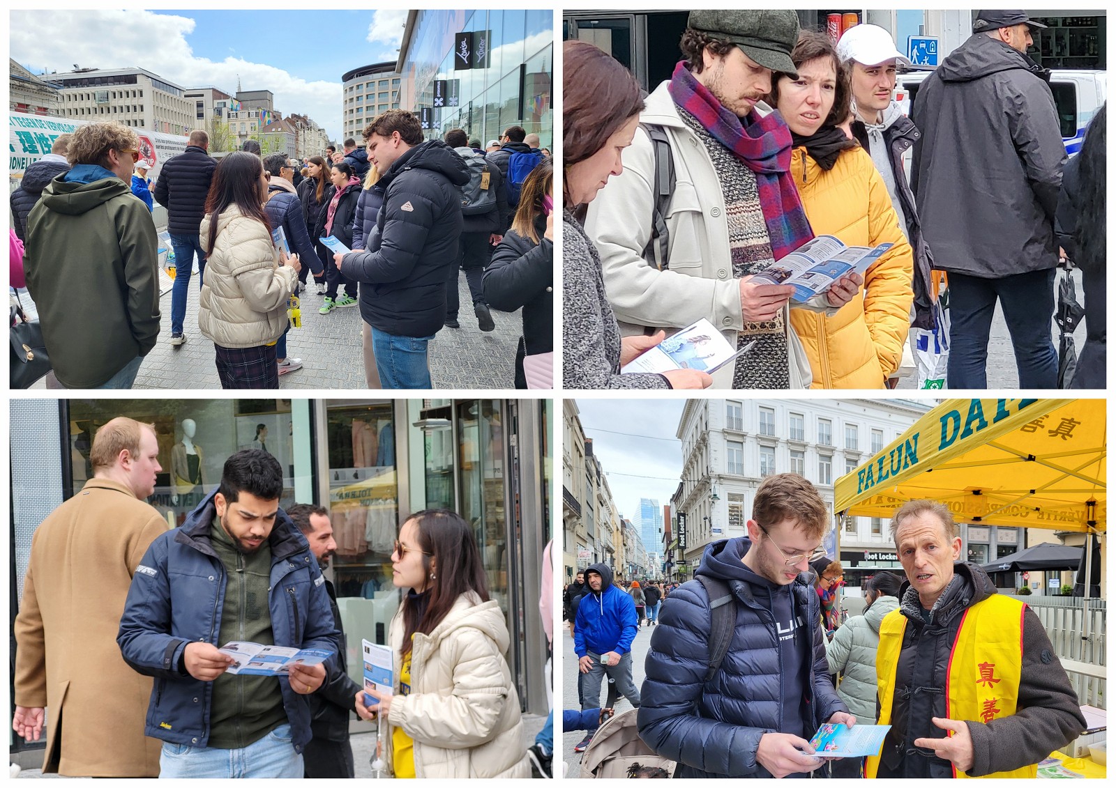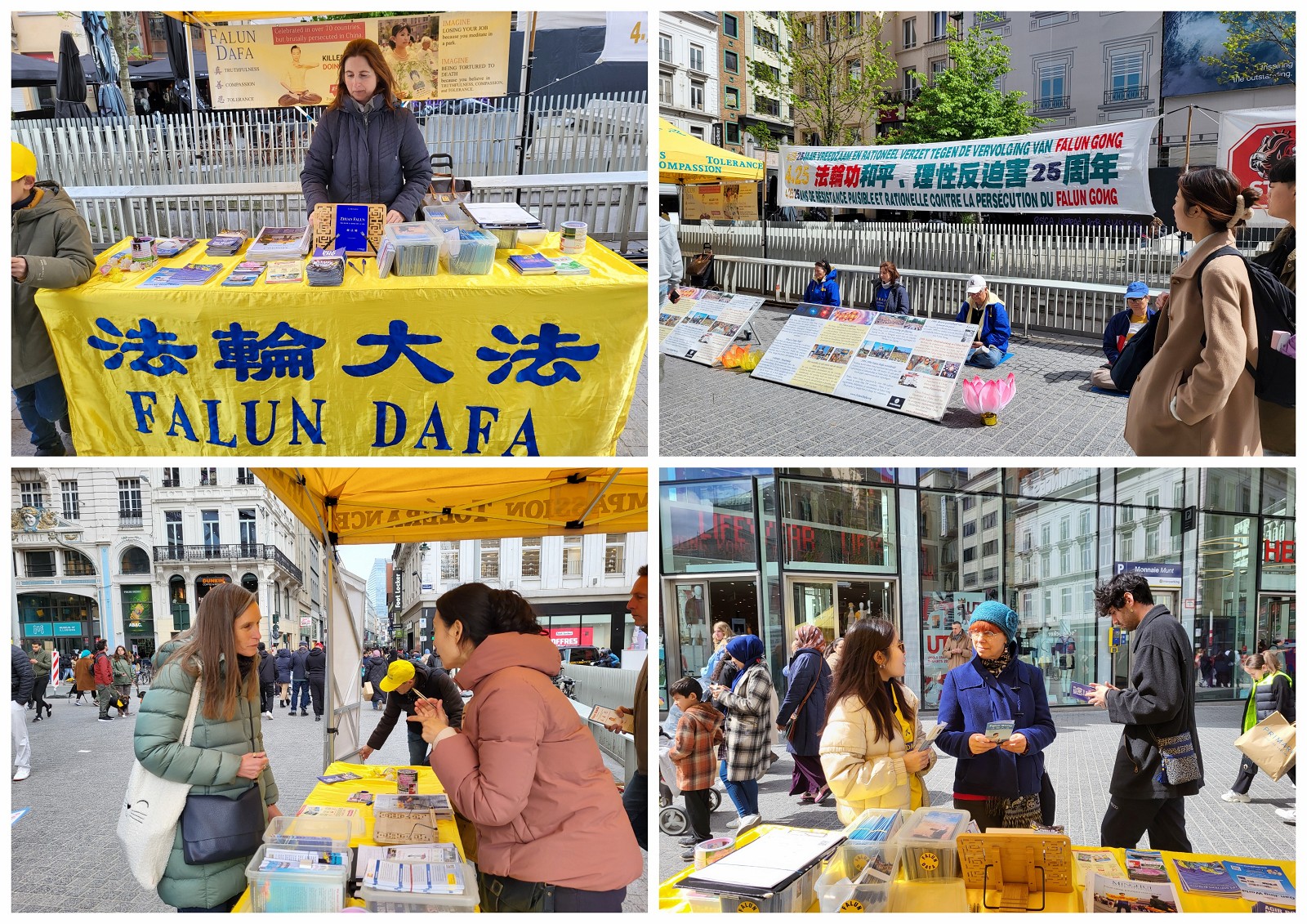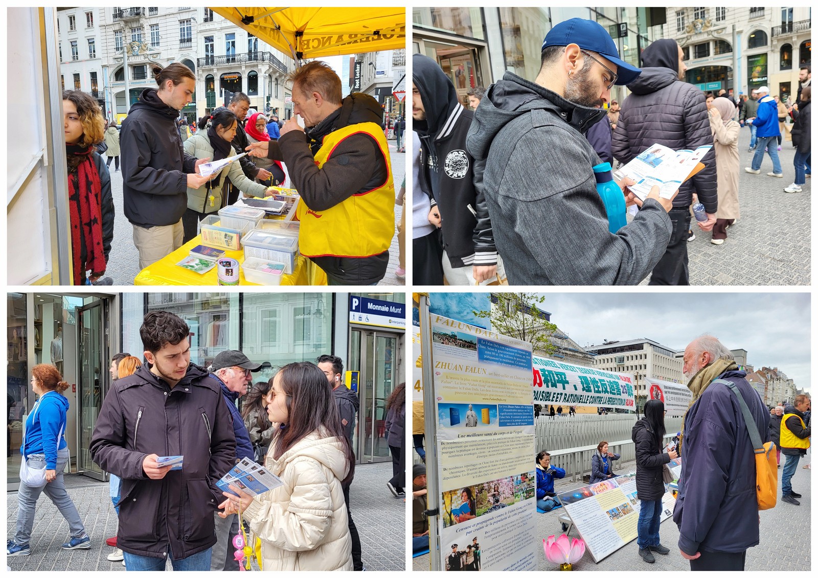 布鲁塞尔人来人往的商业大街,在真相摊位前许多人驻足观看,有的与学员交谈了解迫害真相;一些人询问学炼法轮功的地址和联系方式;一位女士拿钱给学员支持学员反迫害,学员感谢她的支持,因法轮功不接受馈赠而婉拒,她欣然地购得法轮大法书籍《转法轮》。