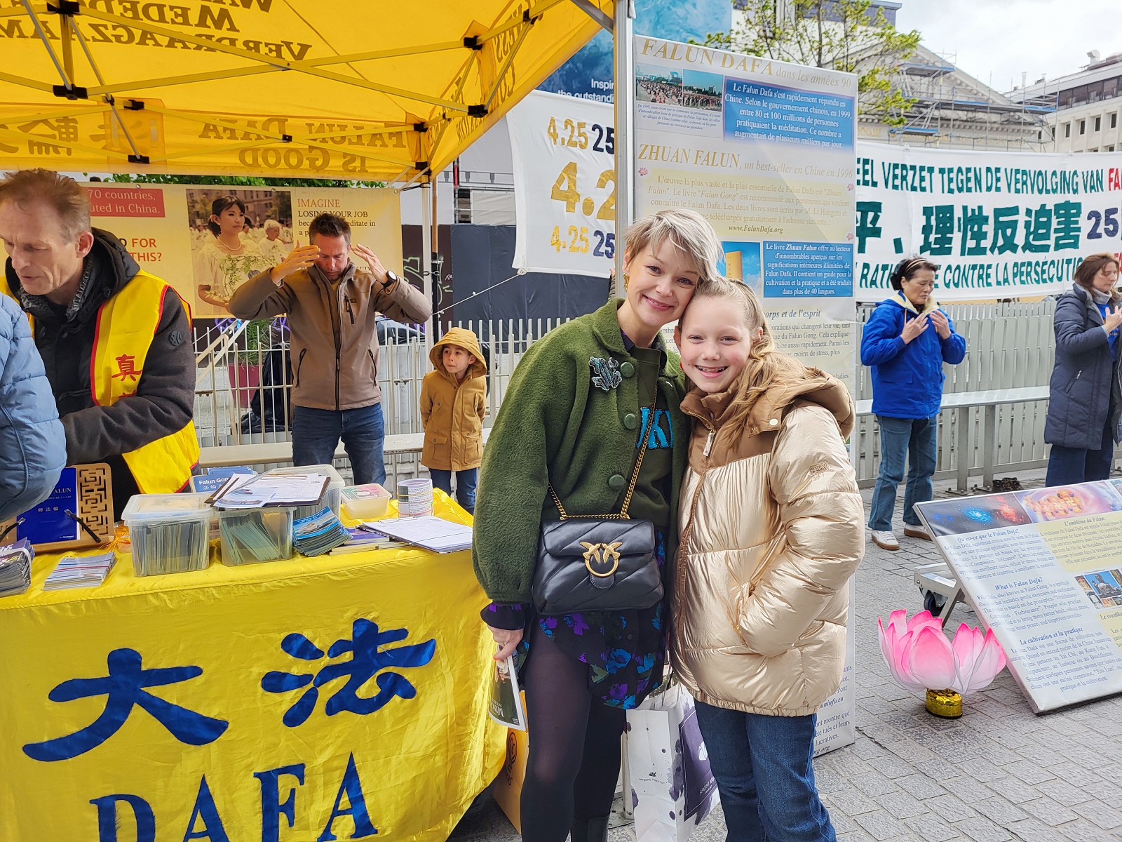 苏菲·范霍夫(Sofie Vanhoof)和女儿路过摊位时被学员的功法演示所吸引,她觉得学员在喧闹的市井中,炼功现场显得那么平静祥和,她非常喜欢法轮功。同时她也注意到横幅上要求中共停止活摘器官的诉求。为能够让法轮功早日得到信仰的自由,她在反迫害征签上签名来支持法轮功。