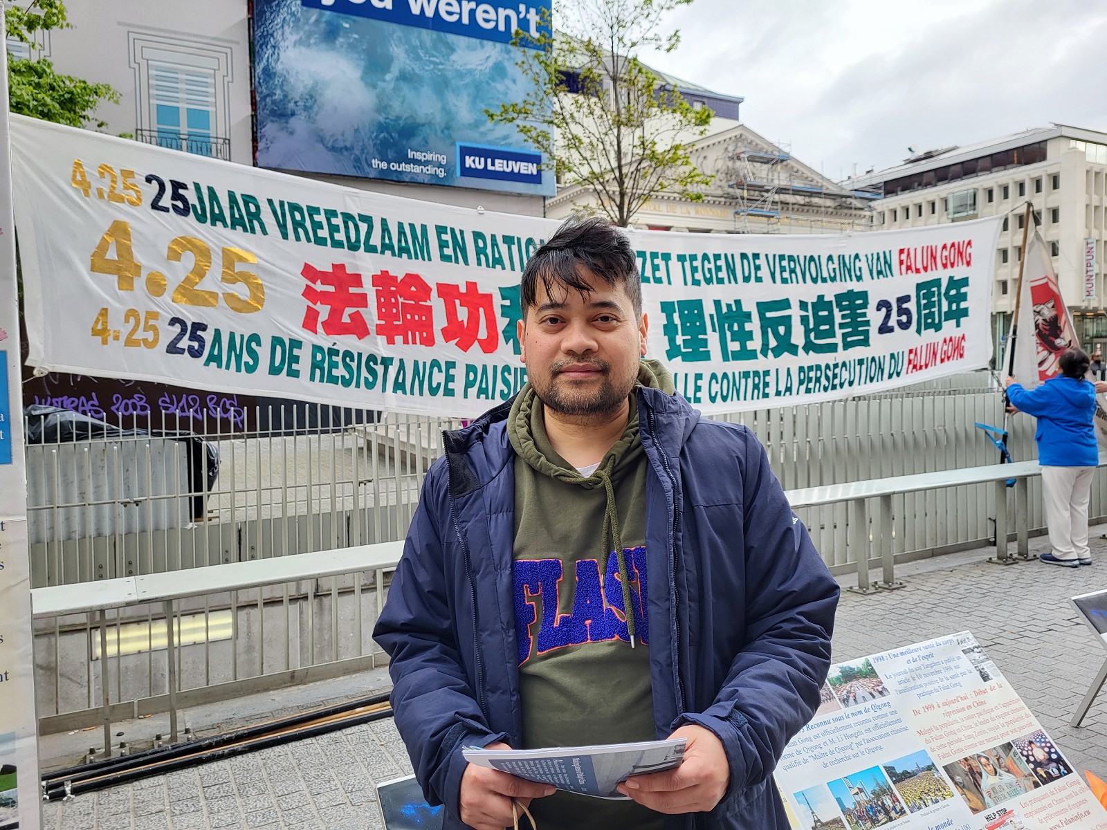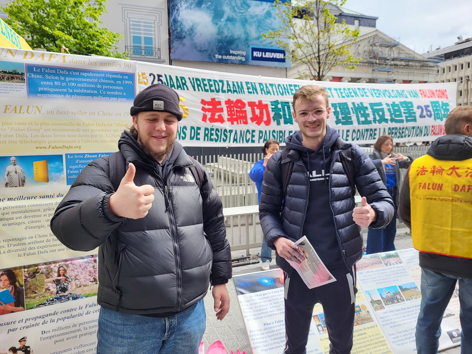 青年人埃米尔·罗斯(Emiel Roose)和他的朋友仔细阅读着展板上的资讯,同时观看学员们炼功。他们向学员询问:“在中国的监狱里被关押的人或者被迫害致死的人,真的有可能会被活摘器官吗?”他们表示发生这样的迫害闻所未闻,感到太可怕了,然后向学员询问更多法轮功被迫害的情况。