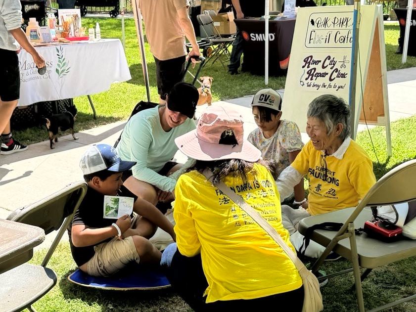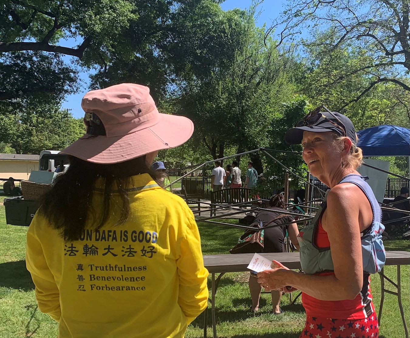 一个白人女孩快速走过又回来,兴奋地告诉学员她的姓就叫法轮(Falun)。学员说:“这可是缘份啊!”她高兴地连说:“是,是,我相信。”
