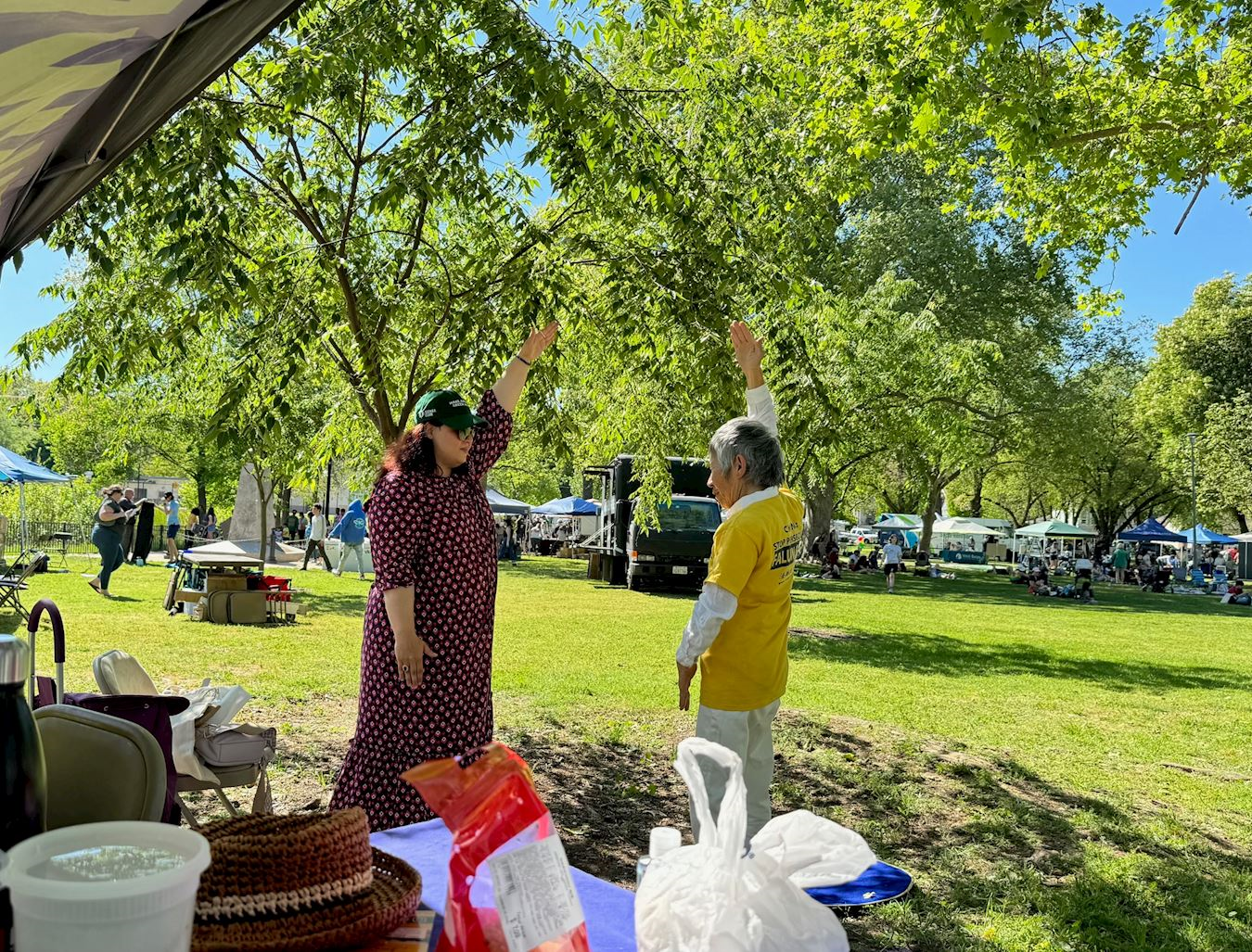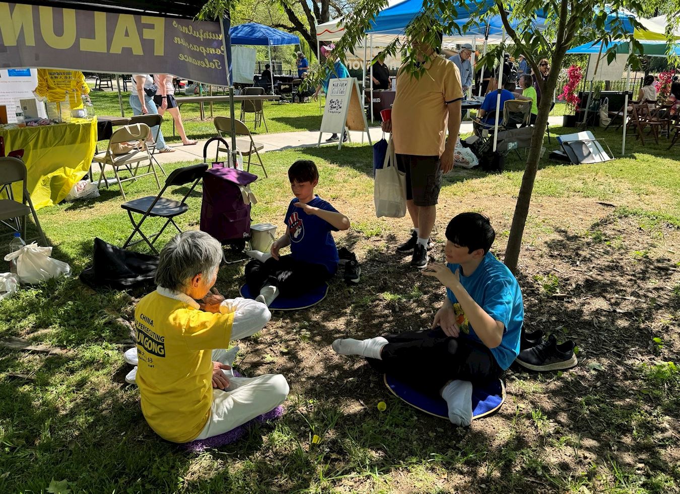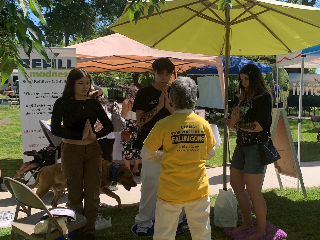 在一天的弘法当中,不断遇到有缘人主动来学功。有的是一家人,有的是朋友,也有独自一人的。就像久遇的知己,一见到大法展位,无需多言就想学。与往年不同的,更多年青人表达了浓厚的兴趣,而且静得下心,五套功法一步到位。就在活动快结束的时候都还有人来学功。