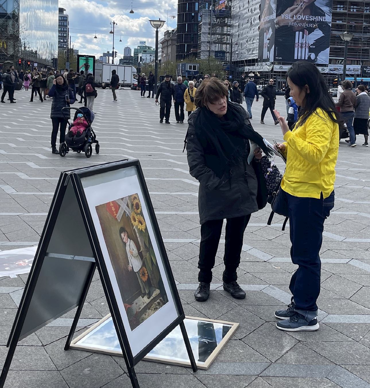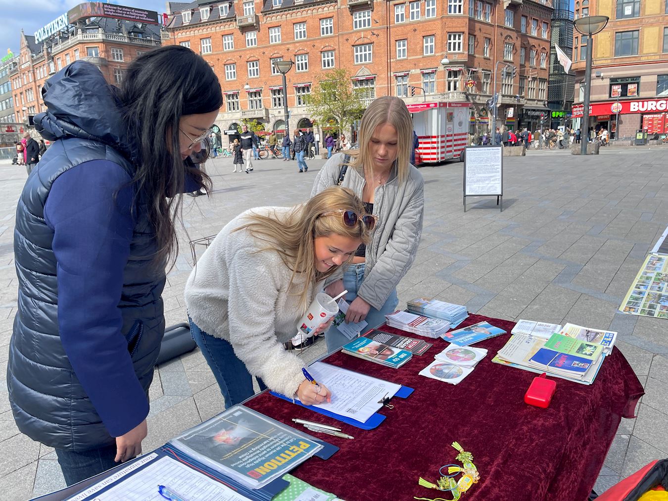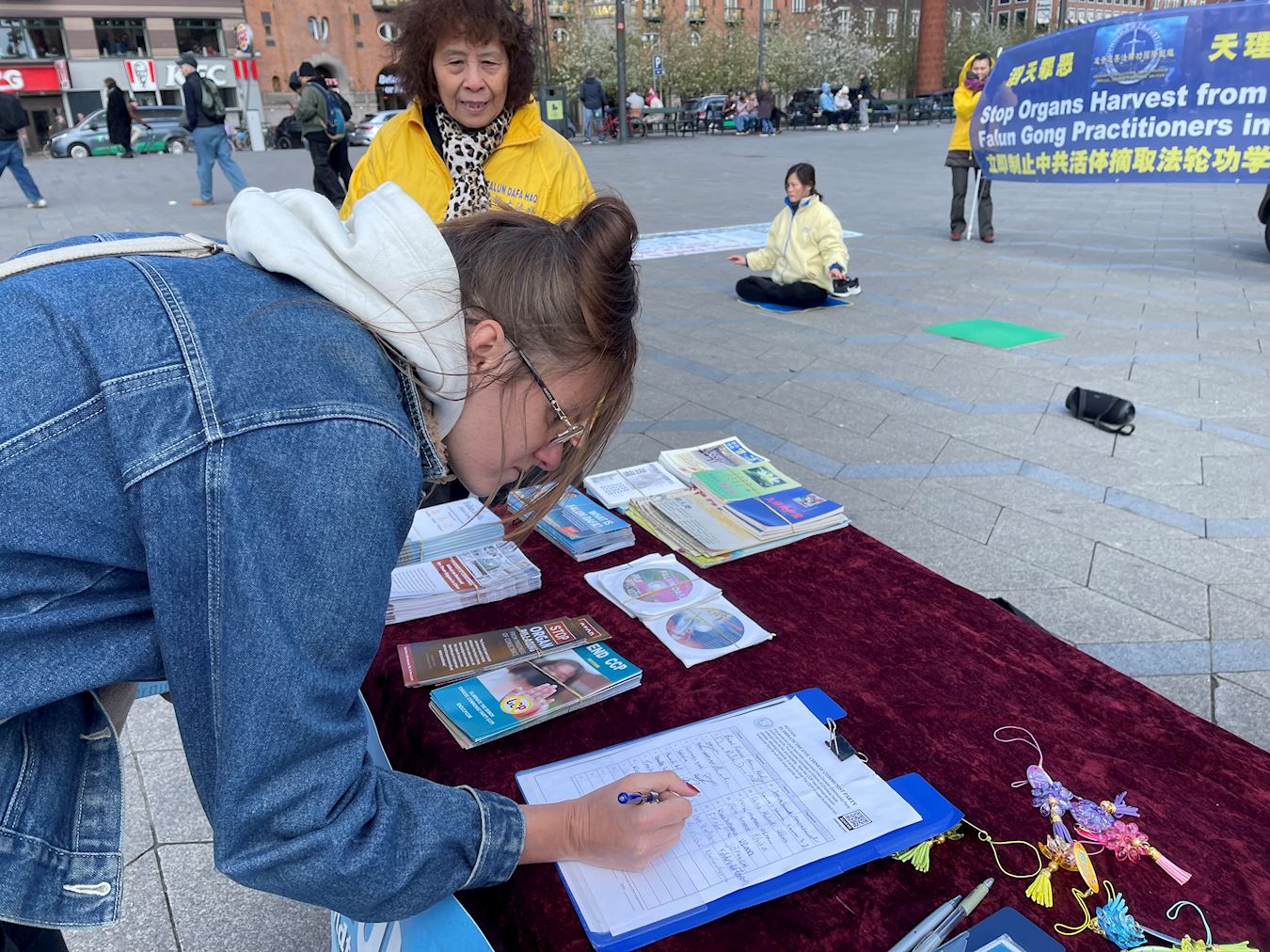 几个年轻人都听得很认真,说太难以想象了,他们详细问了活摘和迫害的事情,学员讲给他们丹麦和中国有医疗方面的合作。他们对活摘非常震惊,然后跑过去签名支持反迫害。