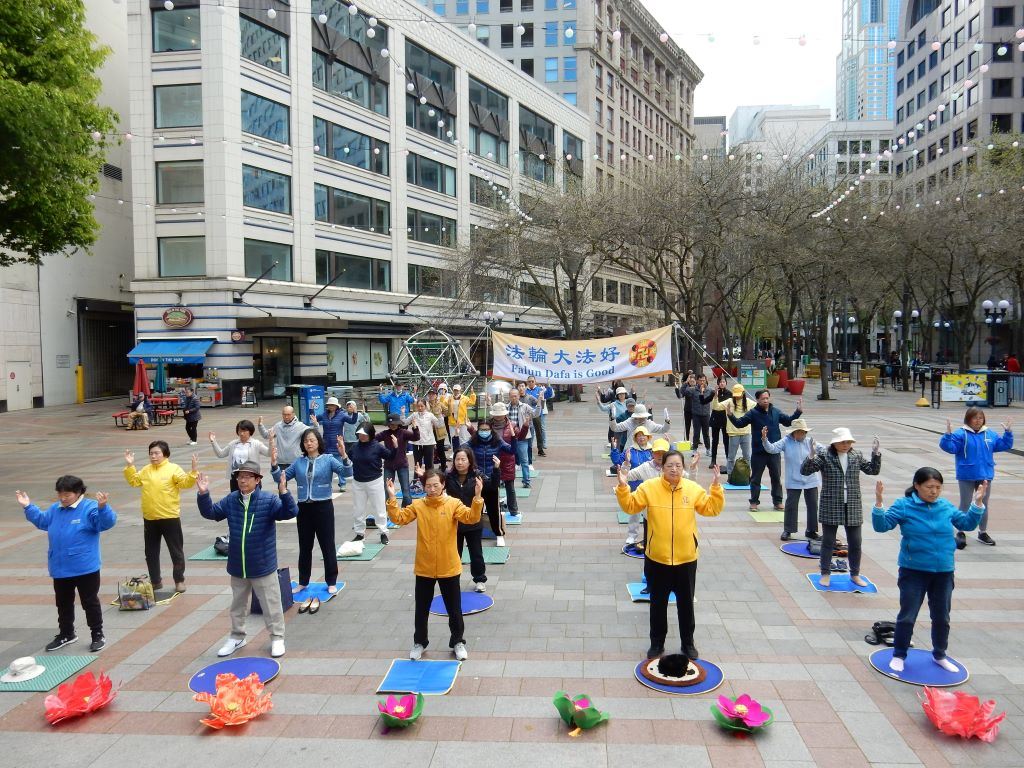 ![]() 图1:零二四年四月二十一日,西雅图地区部分法轮功学员在西雅图市中心西湖公园集体炼功 |